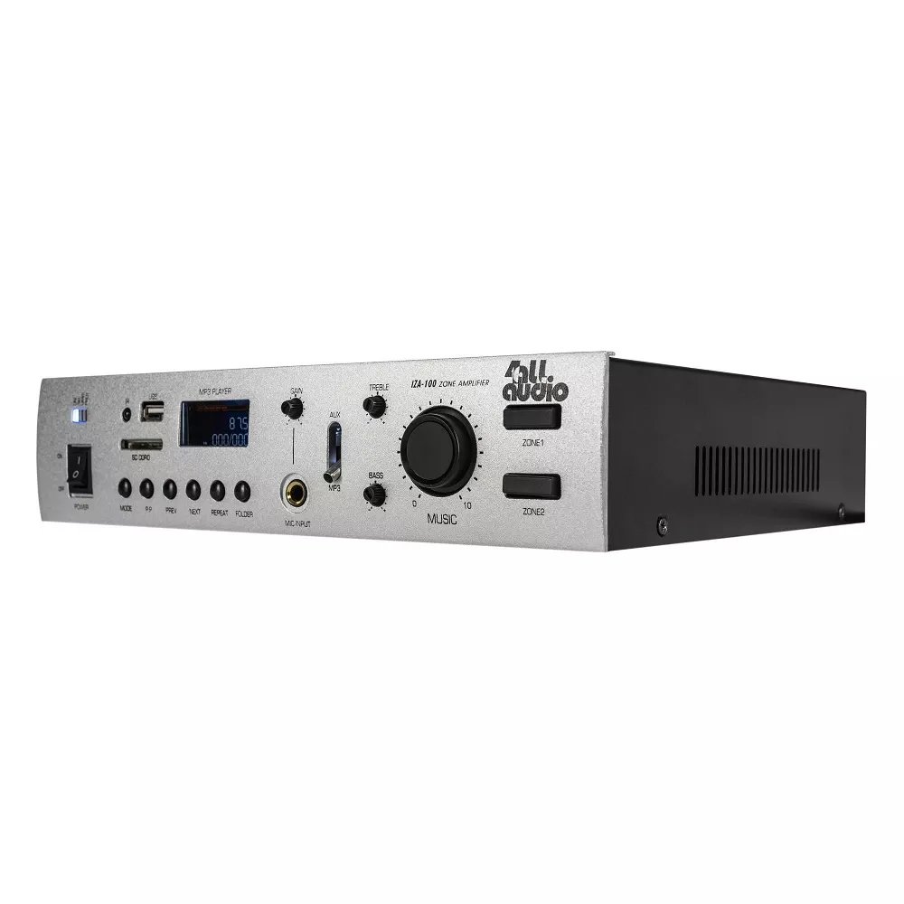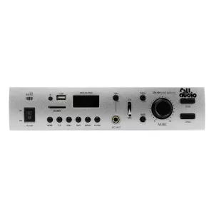 PAMP-100 Трансляційний підсилювач потужності. Потужність 100 Вт. Кількість зон 2. Регулювання зон увімк./вимк. Режими роботи Низькоомний, 4-16 Ом, трансформатор 70-100 В. Діапазон частот, що відтворюються 80 - 18 000 Гц ± 2 дБ. Відношення сигнал/шум >80 дБ. Мікрофонний (TRS), AUX (RCA). Виходи 70В/100В (2 зони), 70В/100В (загальний), 4-16 Ом, AUX (RCA). USB. слот SD. Вбудований MP3-плеєр. FM-тюнер. Bluetooth. Пульт дистанційного керування. Регулювання тону Тембр, бас. Блок живлення 220-240В, 50 Гц. Розмір 290x65x245 мм