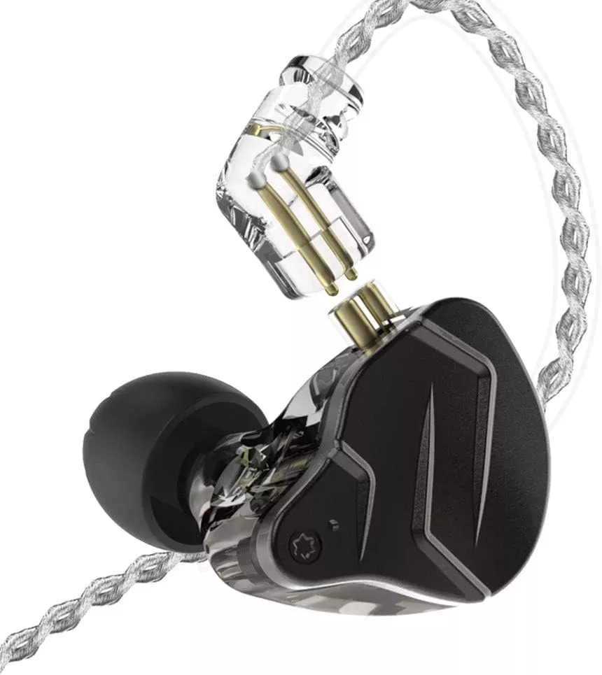 У KZ ZSN PRO X MIC комфортно прослуховувати музику у метро чи під час занять спортом. Звуковод зроблений з металу, на ньому є поглиблення для кращого зчеплення з амбушюрами та сітка для захисту від попадання пилу та бруду. За низькі та середні частоти в оновленій моделі відповідає динамік 10мм, за високі – арматурний драйвер 30095. Гібридна конструкція дозволяє досягти хорошого звучання всього частотного діапазону. У комплект входить срібний кабель, який виготовлений з якісних матеріалів і чудово передає звук. L-подібний штекер та розгалужувач виконані із щільної гуми та не зношуються навіть через кілька років. Плетений провід не заламується, а біля конектора є невеликий силіконовий завушник для більшого комфорту при носінні. На кабелі ZSN PRO X MIC є невеликий блок керування з мікрофоном. Прийняти виклик можна одним натисканням кнопки, а тривале натискання клавіші скине його.