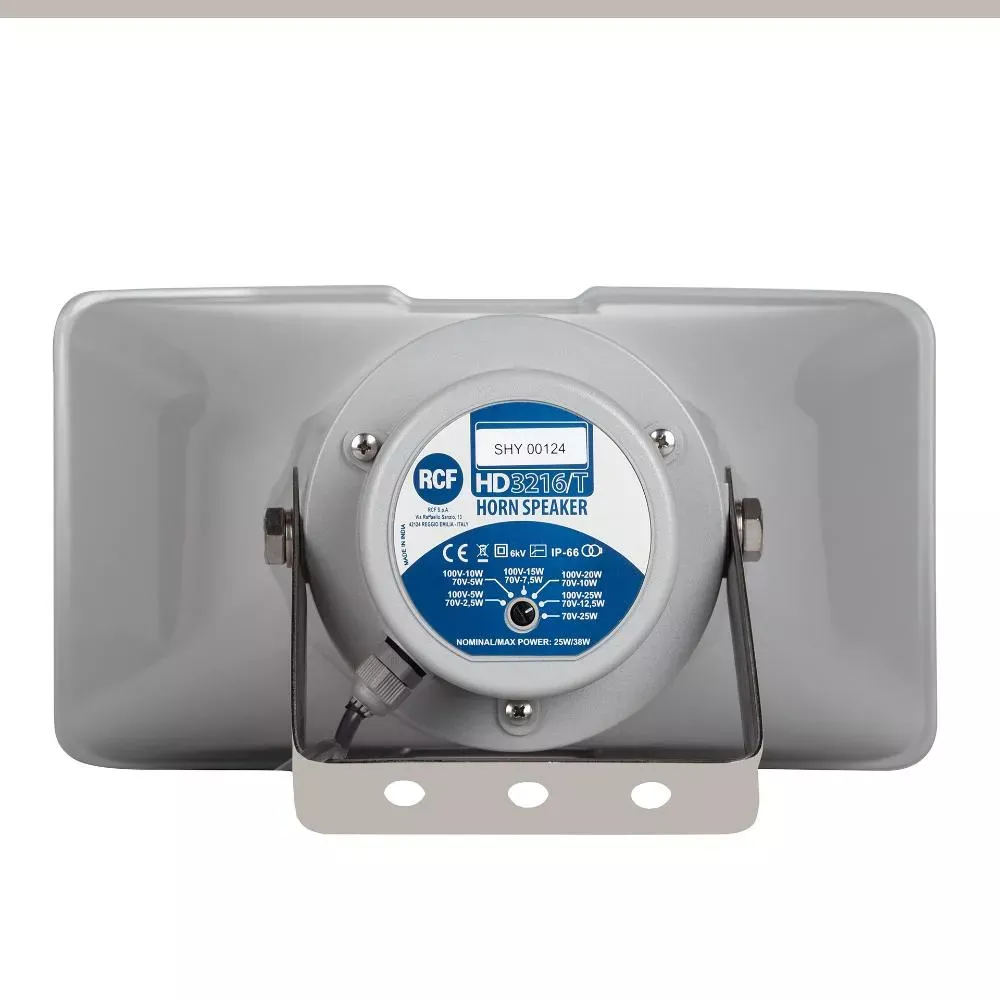 RCF HD3216/T — рупорний гучномовець для професійних трансляційних систем, розрахований на роботу у 70 В / 100 В лінійних мережах та високі вимоги до розбірливості мови на великих відкритих просторах. Він поєднує брендову якість RCF, компактний рупорний корпус, вбудований трансформатор з кількома ступенями потужності та захист IP66 для роботи всередині й зовні приміщень.