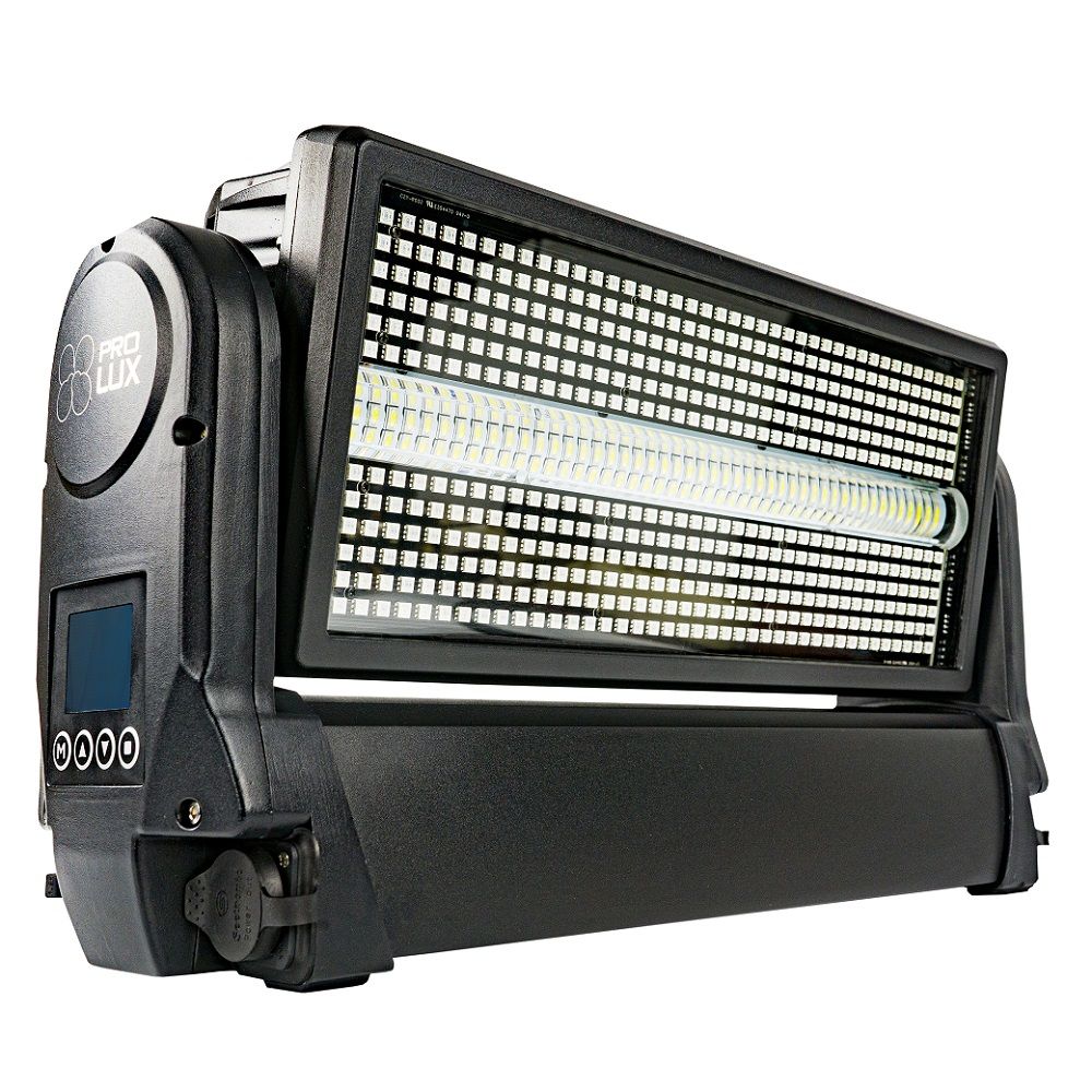PRO LUX MOVING STROBE — це професійний світлодіодний гібридний прилад, який поєднує в собі функції потужного стробоскопа і повнокольорової (RGB) заливної панелі (wash), а також має моторизований механізм нахилу (tilt) для динамічних ефектів. Ідеально підходить для використання на концертах, фестивалях, в клубах, театрах і будь-яких інших заходах, де потрібні яскраві динамічні світлові ефекти.