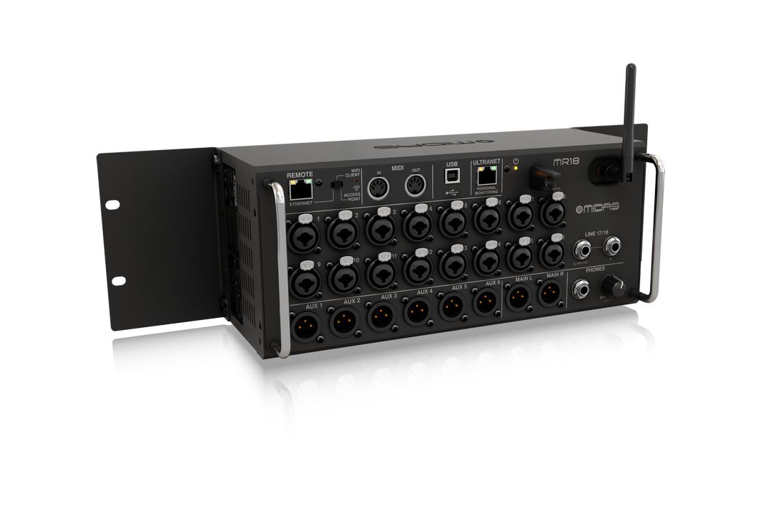 Midas MR18 - рековий цифровий мікшерний пульт на 18 входів/6 шин з 16 преампами Midas Pro, автомікшуванням, Wi-Fi роутером, 18-канальним USB-інтерфейсом, DSP-процесором, управлінням через MIDI/USB або через додатки для Mac/PC/Linux/iOS/Android.