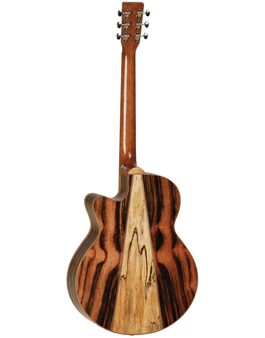 TJ4CE — це шедевр акустичної досконалості та сучасної універсальності, ретельно розроблений у формі корпусу Super Folk, що забезпечує одночасно комфорт та потужне звучання. Завдяки поєднанню виняткових порід деревини та передової електроніки, ця гітара є чудовим вибором для музикантів, які цінують збалансований та візуально привабливий інструмент. Форма корпусу Super Folk поєднує найкраще з обох світів, пропонуючи зручність під час гри без шкоди для потужності тону. Цей дизайн ідеально підходить для тих, хто шукає добре збалансований, універсальний звук для різноманітних стилів та жанрів. Він забезпечує чудову грабельність та відчуття близькості до інструмента, що робить його прекрасним вибором як для початківців, так і для досвідчених гітаристів. Гітара має верхню деку з цільної ялини, відомої своєю винятковою чутливістю та чистотою тону. Це гарантує яскраве, чисте та чітке акустичне звучання з добре вираженим динамічним діапазоном, що ідеально підходить для гри пальцями, боєм та медіатором. Що дійсно вирізняє цю гітару, так це її приголомшлива трикомпонентна задня дека, виготовлена з комбінації дерева амара та «шпальтованого» манго. Окрім візуально захопливих візерунків, ці породи дерева збагачують унікальний тональний характер гітари. Амара надає теплоти й балансу, а шпальтоване манго додає складності та глибини, створюючи виразний та насичений тембр. Обичайки з амари доповнюють загальний тональний профіль, забезпечуючи гармонійний звуковий відгук. А для сучасних музикантів гітара оснащена системою еквалайзера Fishman Presys. Ця передова електроніка дозволяє точно налаштовувати ваше звучання при підключенні, а вбудований еквалайзер, фазовий контроль та тюнер гарантують, що ваш посилений тон буде таким же чистим і динамічним, як і акустичний.