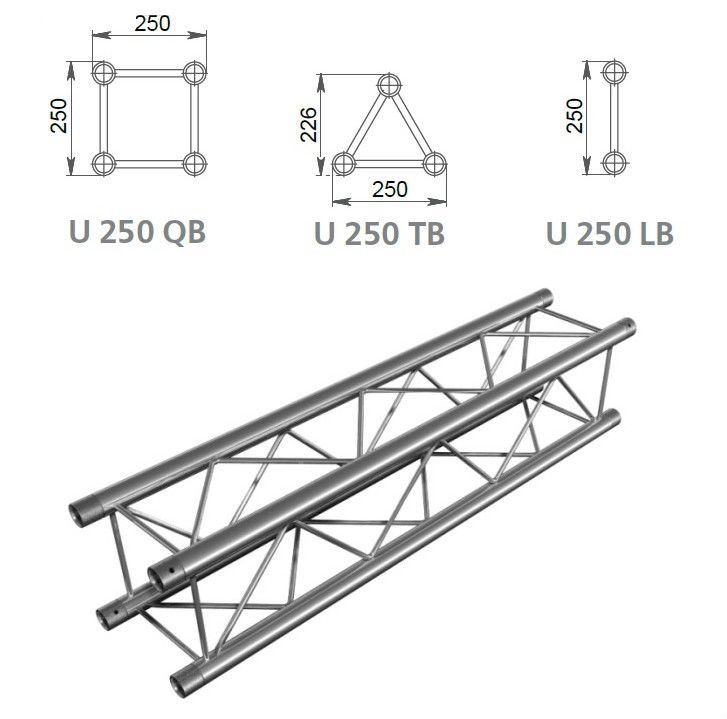 Порівняно з лінійкою U-300 вони мають меншу товщину стінки несучої труби і менший діаметр діагональних укосів. Так само універсальні ферми U-250 відрізняються від "старшої" серії меншою відстанню між несучими трубами (250 мм замість 300мм). Тому вони більш компактні та доступні за ціною. Їх можна застосовувати для створення конструкцій з невеликою довжиною прольоту, а також у ситуаціях, коли вага підвішуваного обладнання або декорацій невелика. Діаметр несучої труби такий самий, як і в серій U-300 і UL-300. Це дає змогу застосовувати стандартні кріплення світлових приладів у вигляді хомутів і гаків, універсальних затискачів.