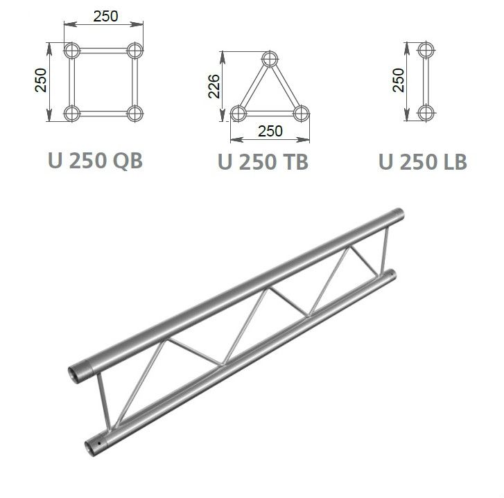 Порівняно з лінійкою U-300 вони мають меншу товщину стінки несучої труби і менший діаметр діагональних укосів. Так само універсальні ферми U-250 відрізняються від "старшої" серії меншою відстанню між несучими трубами (250 мм замість 300мм). Тому вони більш компактні та доступні за ціною. Їх можна застосовувати для створення конструкцій з невеликою довжиною прольоту, а також у ситуаціях, коли вага підвішуваного обладнання або декорацій невелика. Діаметр несучої труби такий самий, як і в серій U-300 і UL-300. Це дає змогу застосовувати стандартні кріплення світлових приладів у вигляді хомутів і гаків, універсальних затискачів.
