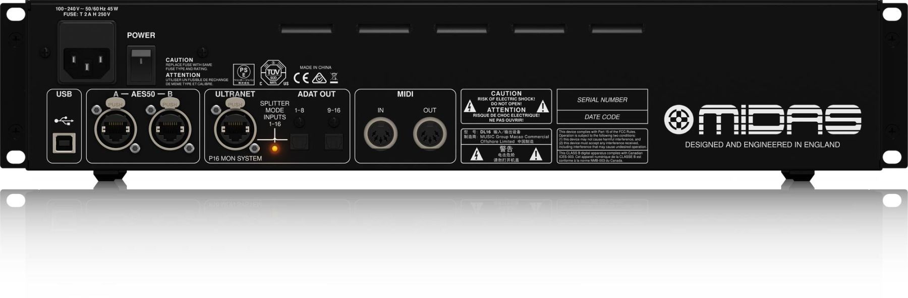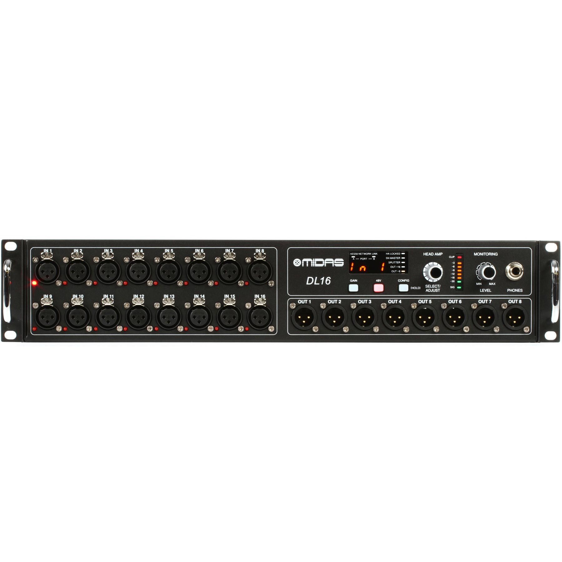 Зв'язуючи сцену і центральний пульт управління звуком, DL16 від Midas має 16 входів і 8 виходів, а також 16 мікрофонних передпідсилювачів, які повністю програмуються і дистанційно управляються, з перемикачами для подачі фантомного живлення + 48 В. Стейдж-бокс оснащений 8 електронно збалансованими низькоомними виходами лінійного рівня, крім того, всі входи і виходи DL16 сприймають як балансний, так і небалансний сигнал, мінімізуючи можливість погіршення його якості, виникнення шуму і перехресних перешкод. DL16 також оснащений цифро-аналоговими перетворювачами Cirrus Logic, що забезпечують зниження рівня власного шуму і більш низьке спотворення сигналу, а також фільтрацію після конвертації для усунення широкосмугових перешкод.