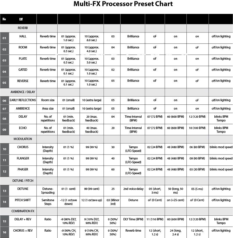 Розроблені всесвітньо відомою технічною командою KLARK TEKNIK, ці досконаліші FX-процесори характеризуються 32 пресетами студійного класу з подвійними параметрами, Tap-функцією та збереженими користувацькими параметрами налаштувань, що зберігаються. Ці ефекти забезпечують широкий ранг поліпшених опцій від милих і спокійних до абсолютно диких.