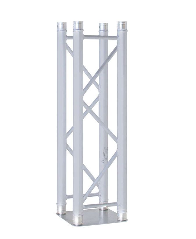 Ця підлогова основа для квадратних професійних ферм серії U300 і полегшених ферм U300L являє собою масивну алюмінієву пластину для монтажу алюмінієвих ферм у вертикальному положенні. Ця підлогова опора для ферм має монтажні отвори для встановлення з'єднувальних напівбобишок. Завдяки великій площі вона забезпечує надійне встановлення конструкції. Виріб має привабливий зовнішній вигляд і компактні розміри, як у робочому, так і в транспортувальному положенні. У комплект поставки входять чотири монтажні напівбобишки для з'єднання з фермами. Пластини мають отвори по кутах для можливості їх кріплення за допомогою шурупів до дерев'яної підлоги. Це забезпечує найбільшу стійкість конструкції.