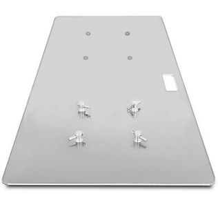 Ця підлогова основа для двох квадратних професійних ферм серії U300 і полегшених ферм U300L, являє собою масивну сталеву пластину для монтажу алюмінієвих ферм у вертикальному положенні. Ця підлогова опора для ферм має монтажні отвори для встановлення з'єднувальних напівбобишок. Завдяки великій площі вона забезпечує надійне встановлення конструкції. Виріб має привабливий зовнішній вигляд і компактні розміри, як у робочому, так і в транспортувальному положенні. У комплект поставки входять вісім монтажних напівбобишок для з'єднання з фермами. Пластини мають отвори по кутах для можливості їх кріплення за допомогою шурупів до дерев'яної підлоги. Це забезпечує найбільшу стійкість конструкції.