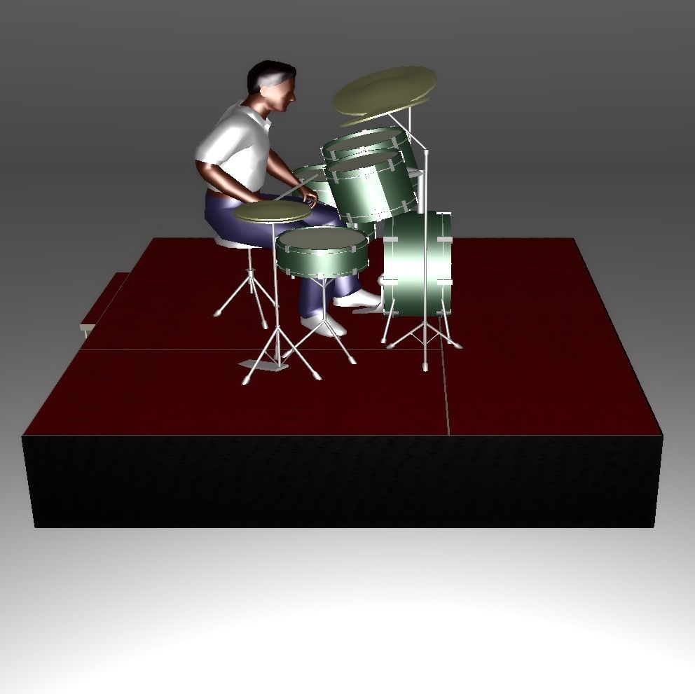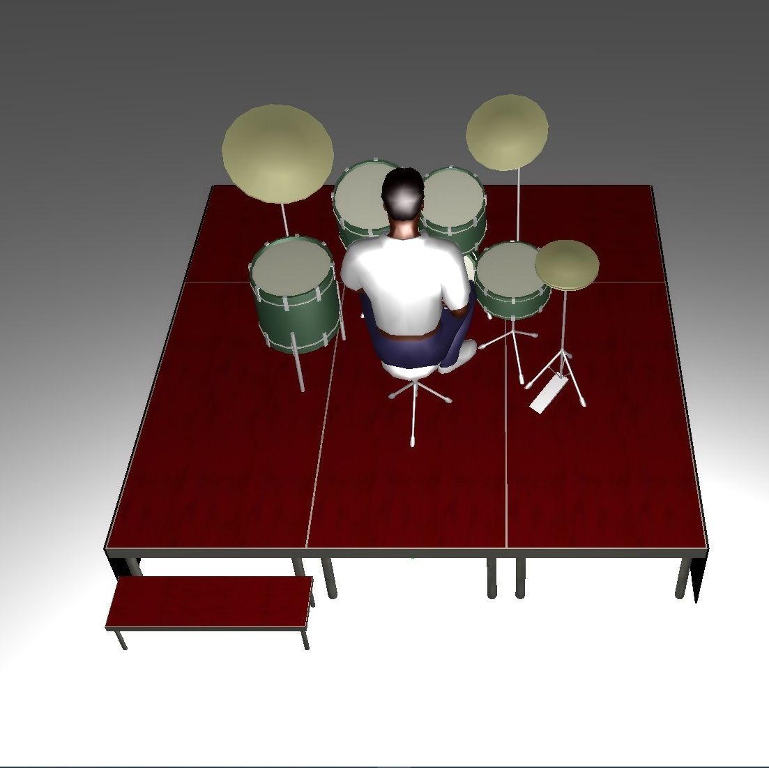 Подіум під барабани зібрано з чотирьох стандартних модулів підлоги розміром 2х1м. і одного модуля 1х1 м. Таким чином, ви отримаєте максимально рівну поверхню розміром 3х3м для встановлення барабанів. Модулі підлоги ідеально стикуються між собою, не утворюючи щілин і не мають нерівностей на стику. Покриття з фанери має шорстку поверхню, яка перешкоджає ковзанню.