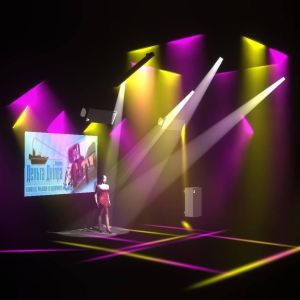 Для создания лучевых эффектов и подсветки потолка с применением гобо-трафаретов, на каркасе потолка симметрично разместили четыре вращающихся головы Halo LED Spot 150 MK2. В качестве фронтальных приборов сцены были использованы LED прожекторы Free Color P1810A.