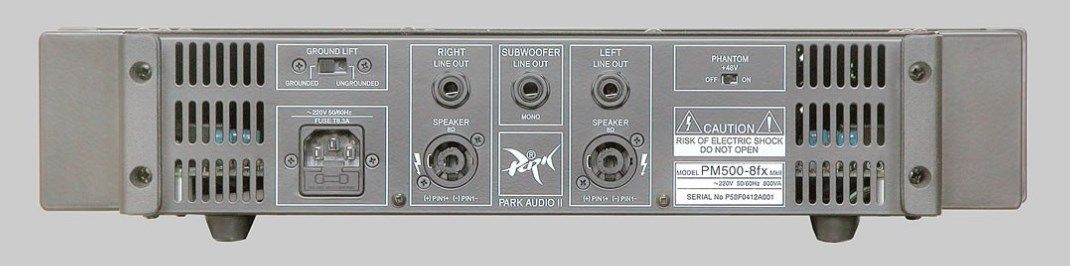Park Audio PM500-8fx MkII – является усилителем микшером с наличием естественного охлаждения и выходных транзисторов MOSFET. Для визуального контроля устройство оснастили шестиуровневым ярким индикатором сигнала для каждого канала, а также индикатором клипа. Мощность усилителя разделяется по двум каналам. При импедансе 8 Ом мощность равняется 250 Вт на канал. Микшер оборудован четырьмя каналами для микрофонов, которые имеют классические трехполосные эквалайзеры, для частотной настройки и контроля. Два линейных стереоканала имеют двухполосный эквалайзер. Помимо всего разработчики оборудовали данную модель цифровым процессором эффектов Alesis, которая насчитывает в своем составе пять программ.