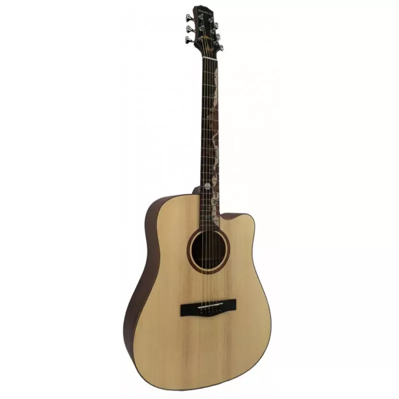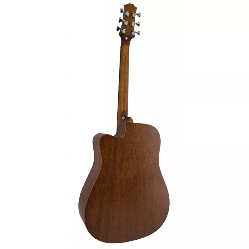 Корпус размером 41 дюйм создан для полного, мощного звучания с хорошим резонансом. Верхняя дека сочетает массив ели и махагони, даря баланс между звонкой четкостью и глубоким теплым тоном. Задняя часть и боковины из ламинированного махагони усиливают этот эффект, делая звук выразительным, но не агрессивным.