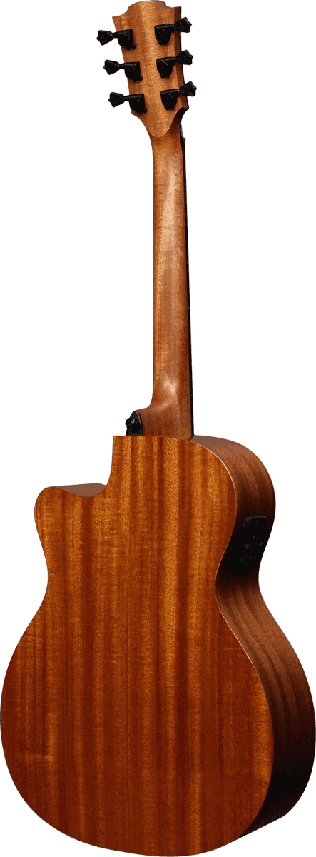 Электроакустическая гитара формы аудиториум с вырезом. Нижняя дека, обечайки и гриф - из дерева Тропической Хайи, накладка на гриф и бридж из коричневой древесины (Браунвуд). Эта гитара имеет 20 ладов, графитовые верхний и нижний порожек. Механика - литая, черная, покрытие атласное. На гитару установлен предусилитель Stage-Lag.