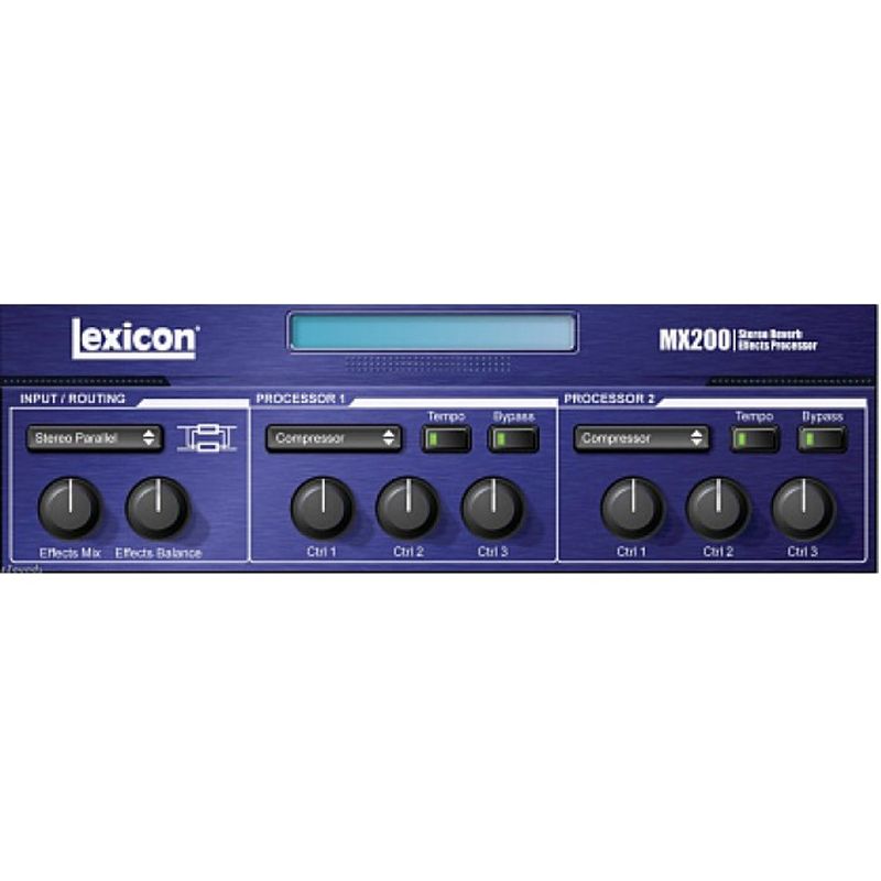 Процессор эффектов Lexicon MX200 содержит 2 отдельных стереофонических процессора, которые можно коммутировать 4 способами: параллельным моно, параллельным моно-стерео, последовательным стерео, параллельным стерео. Каждый процессор имеет кнопки выбора алгоритма эффекта, ввода темпа и обхода, а также 3 регулятора основных параметров со светодиодными индикаторами изменения значений. Кроме того, есть регулятор и два 4-сегментных светодиодных индикатора входного уровня, регулятор баланса уровней прямого/обработанного сигналов для каждого процессора, кнопка выбора варианта коммутации процессоров (со светодиодным индикатором выбранной), светодиодная матрица задействованных в каждом процессоре алгоритмов, колесо выбора пэтча (с возможностью нажатия), 2-символьный светодиодный дисплей номера пэтча или значения параметра, кнопка сохранения пэтча, кнопка предварительного прослушивания (есть 5 встроенных семплов).