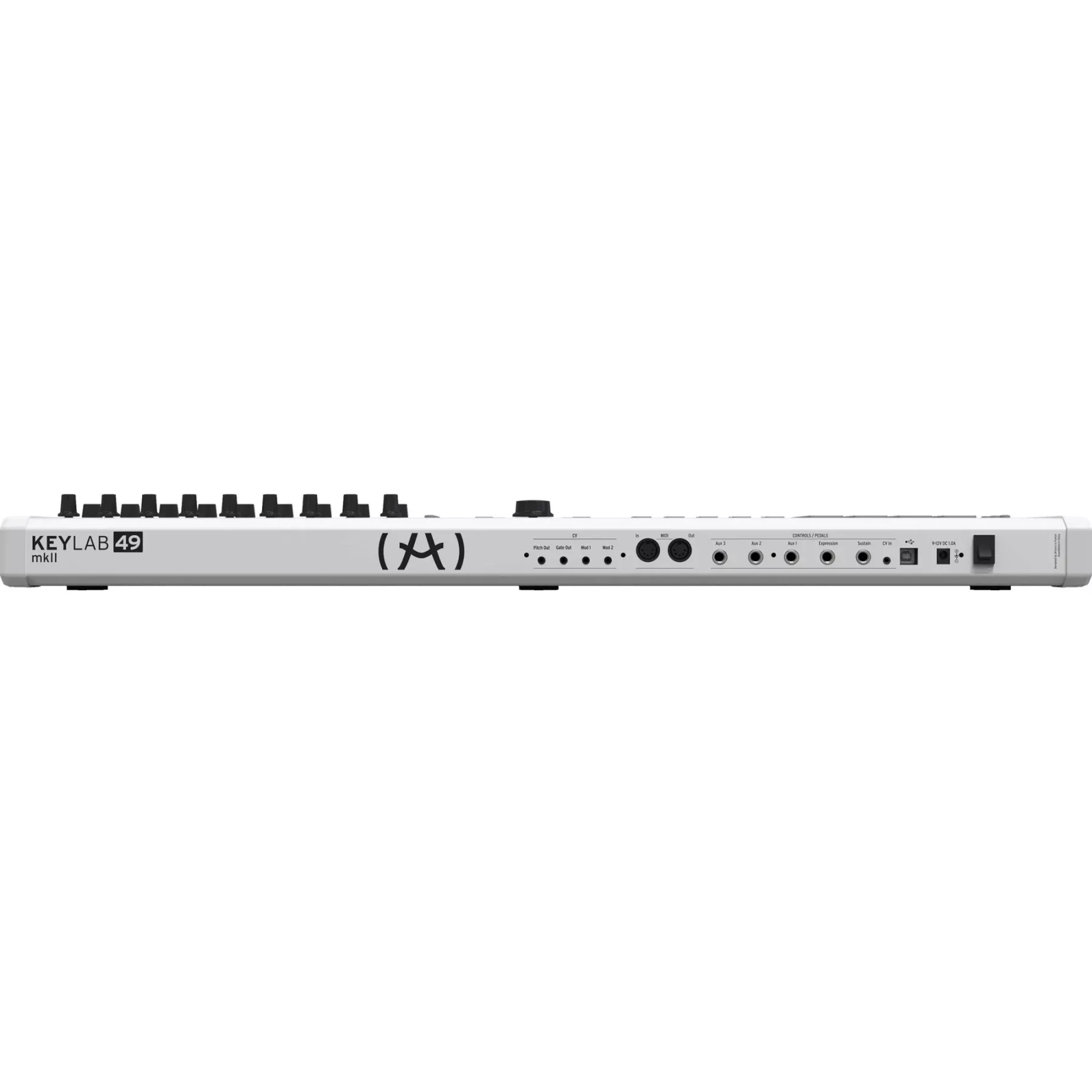 Arturia KeyLab 49 MkII является универсальным MIDI-контроллером, который включает в себя 49 чувствительных к скорости клавиш с послекасанием, кликабельный энкодер, 9 дополнительных энкодеров, 9 слайдеров, 16 с RGB подсветкой сенсорных и чувствительных к давлению пэдов, 6 переключателей управления, 4 командных переключателя, колесо модуляции и колесо pich-bend.