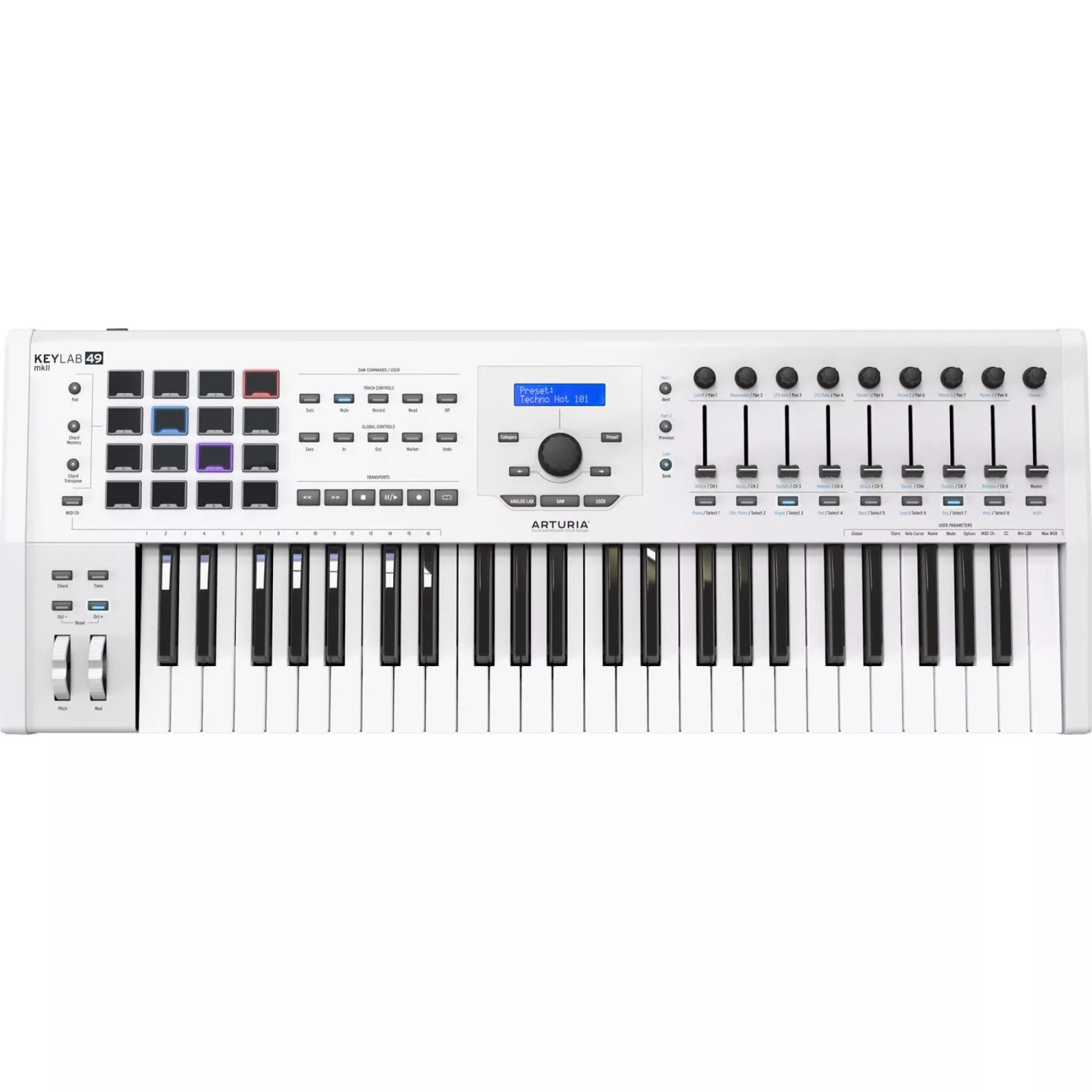 Arturia KeyLab 49 MkII является универсальным MIDI-контроллером, который включает в себя 49 чувствительных к скорости клавиш с послекасанием, кликабельный энкодер, 9 дополнительных энкодеров, 9 слайдеров, 16 с RGB подсветкой сенсорных и чувствительных к давлению пэдов, 6 переключателей управления, 4 командных переключателя, колесо модуляции и колесо pich-bend.