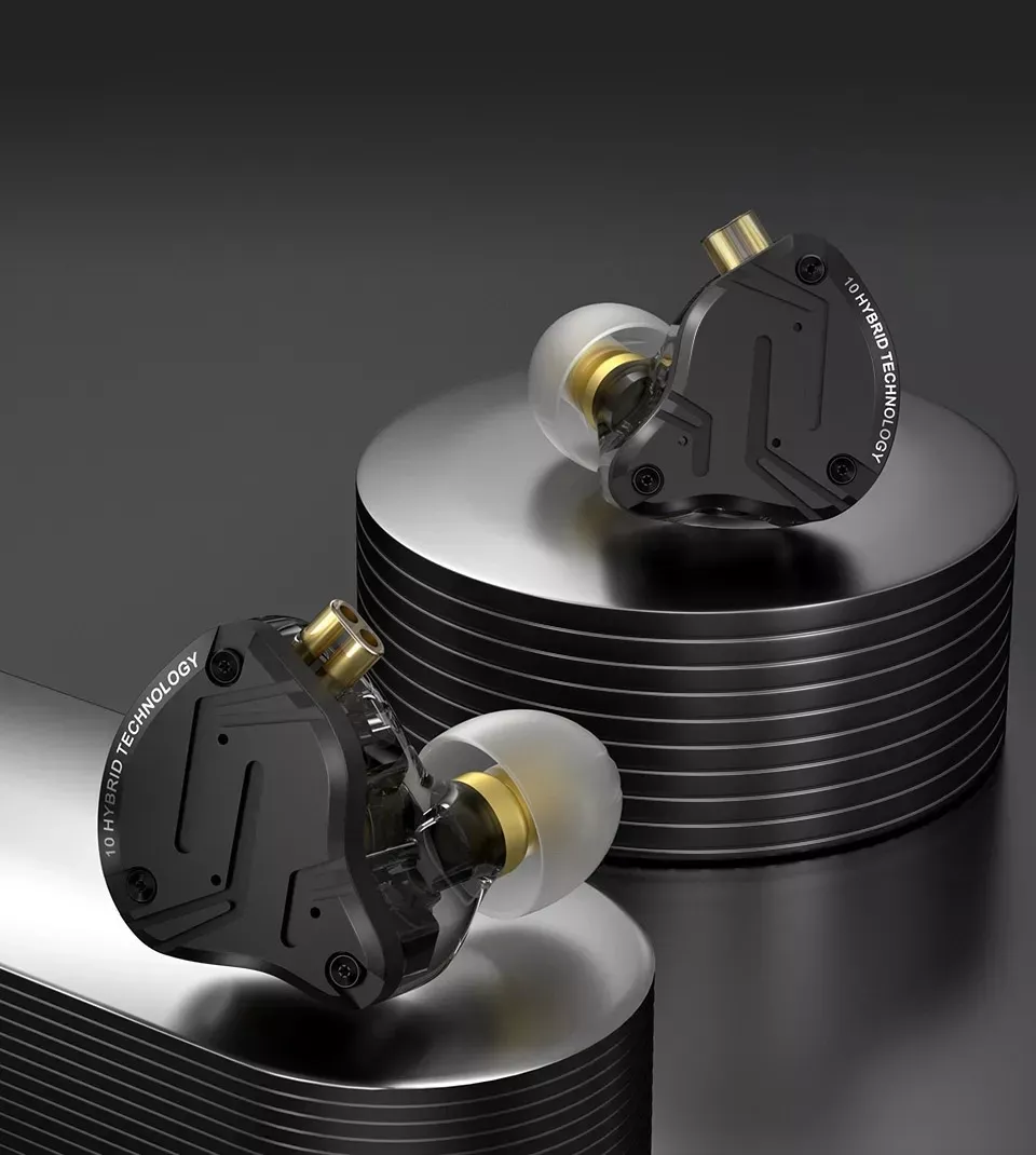 Провод подключен через 2-контактный разъем (тип С) и может быть заменен на любой другой коннектор с тем же типом подключения, если требуется, адаптеры Bluetooth также могут быть подключены. Внутренняя часть корпуса KZZS10 PRO X сделана из прозрачного акрила, через который можно увидеть внутреннюю структуру и 5 эмитентов. На передней части наушников есть металлические панели с минимальным дизайном, покрытые матовой чёрной краской. Задняя посадка позволяет уменьшить эффект микрофона кабеля, а форма ZS10 Pro X унаследована от предыдущей модели KZ.