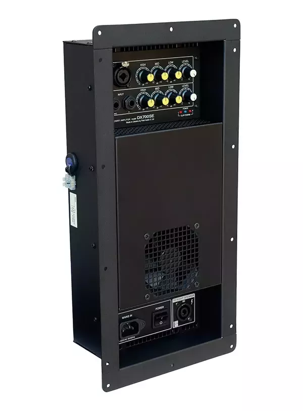 DX700SЕ - профессиональный встраиваемый двухканальный усилитель мощности (модуль) для стереокомплекта (активная + пассивная акустическая система) класса D с двумя линейными 1/4" JACK и микрофонным Combo XLR-1/4" JACK входами и опцией регулировки тембра (НЧ, ВЧ, СЧ).