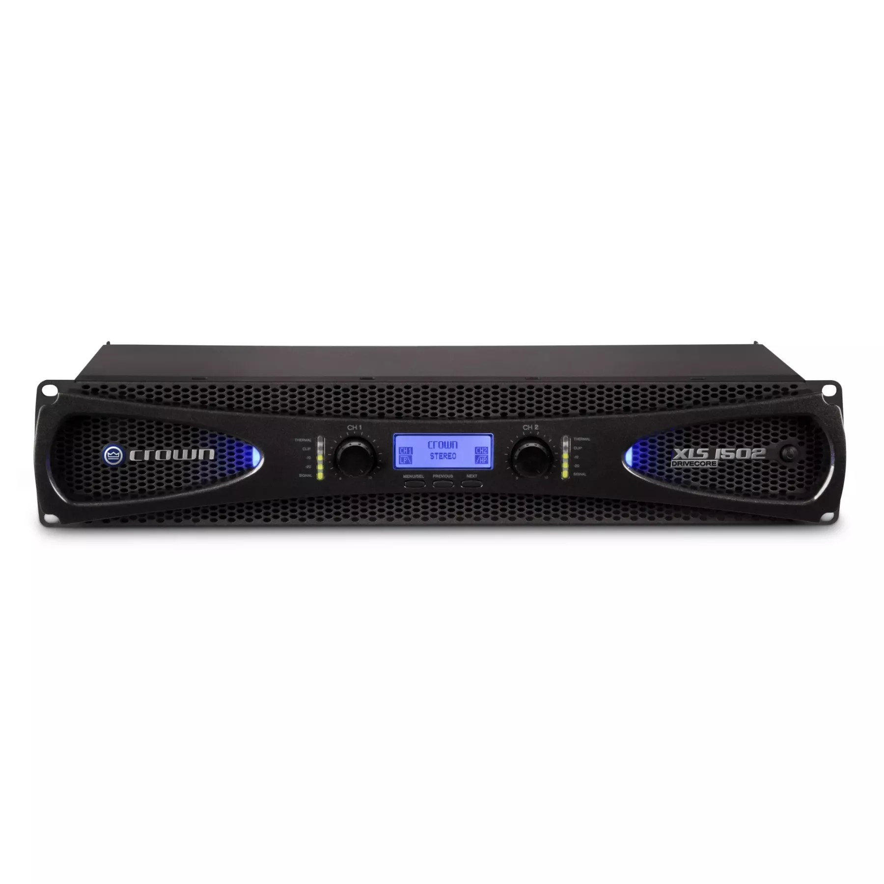 Усилитель мощности Crown XLS1502 оснащен интуитивно понятными регуляторами уровня выходного сигнала каждого канала, кнопкой включения питания с индикатором, а также индикаторами наличия входного сигнала, превышения уровня искажения и неисправности каждого из каналов. Дополнительное удобство в настройке обеспечивает встроенный LCD-дисплей с кнопками для переключения меню. Возможность настройки режима сна, отключения светодиодной индикации и блокировки кнопок обеспечивает дополнительный комфорт при использовании усилителя.