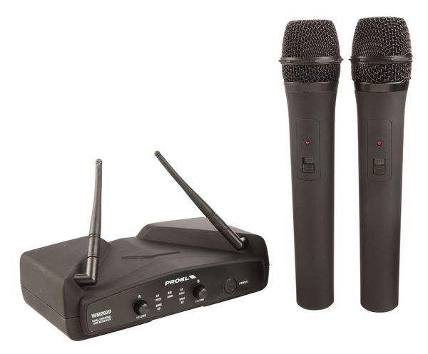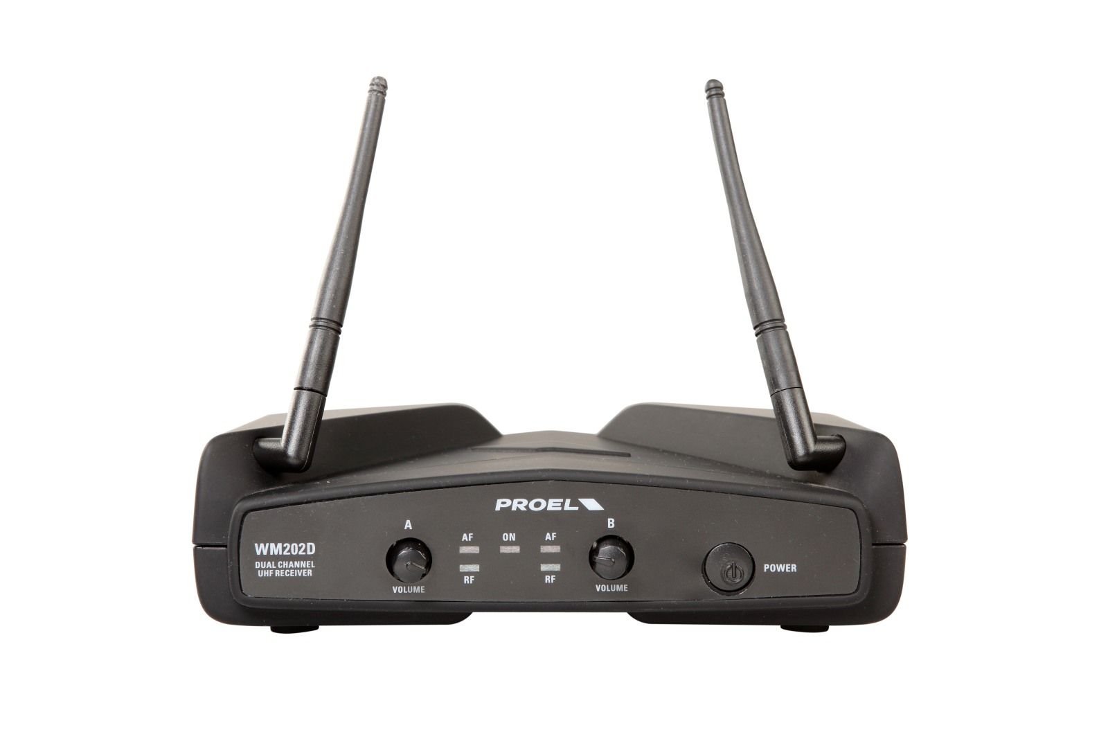 PROEL WM202DM двухканальная микрофонная радиосистема UHF диапазона с фиксированной рабочей частотой, состоящая из 2-х ручных передатчиков WM2M с динамическим капсюлем и настольного 2-х антенного приёмника WM202D.