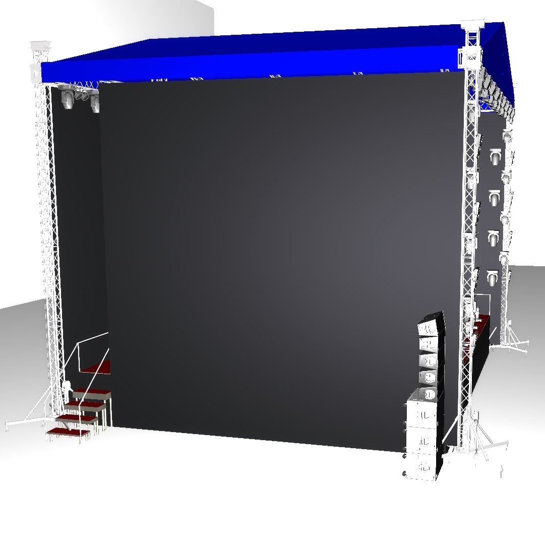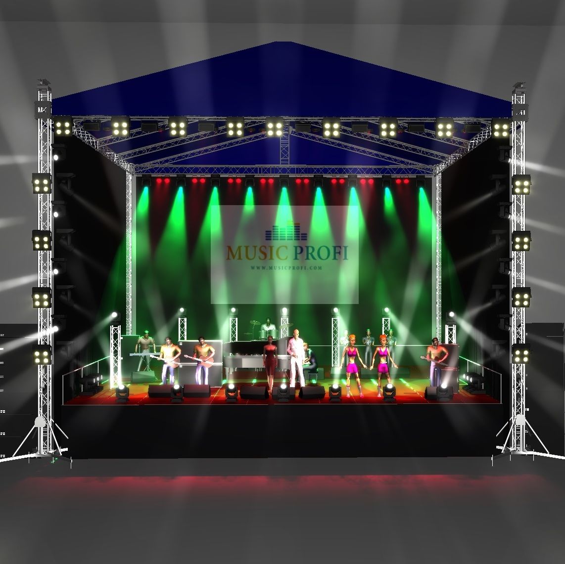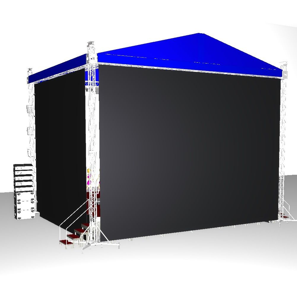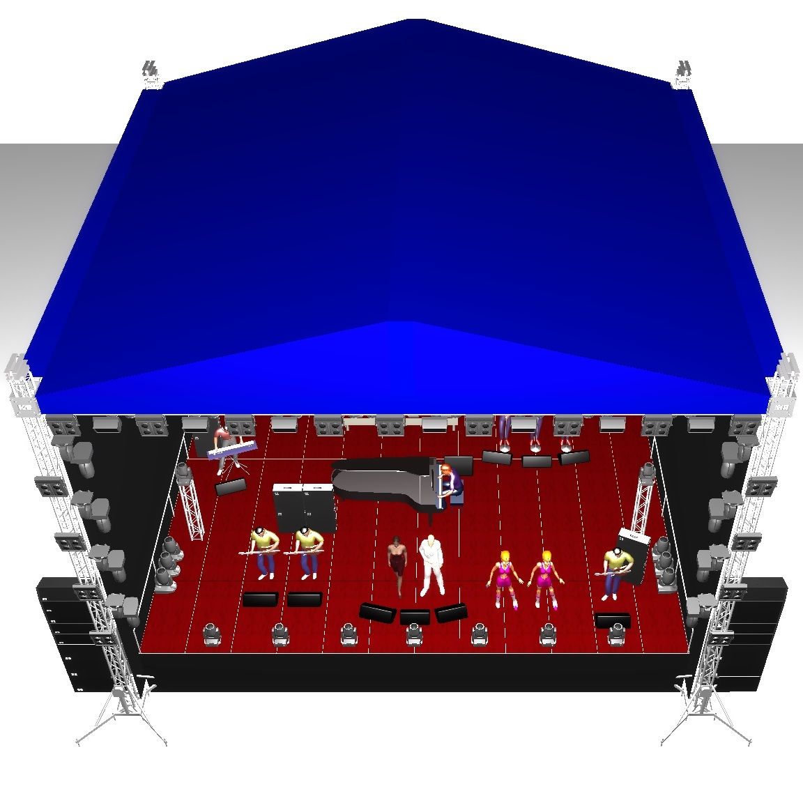 В комплект поставки входит алюминиевый каркас крыши, система растяжек, состоящая из тросов, спансетов и трещоток для натягивания тросов. Так же в комплектацию этой подъемной крыши включены: тент с системой растяжек, одежда сцены (задник и боковины) изготовленная из радио ткани, и система труб для натяжения тента.