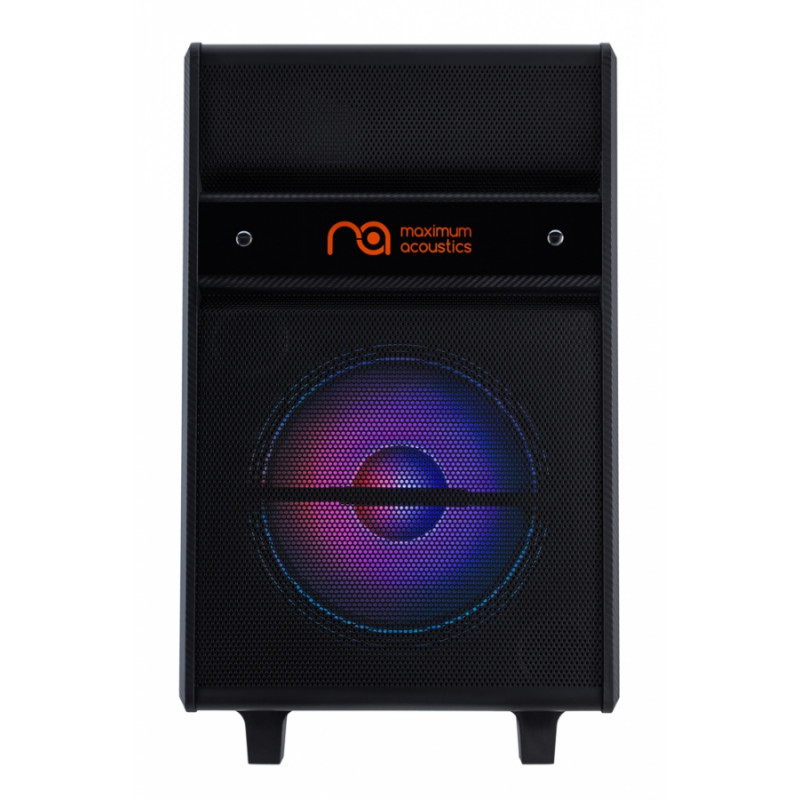 Maximum Acoustic MusicBAND.100 - це мобільний двосмуговий акустичний кабінет зі значним внутрішнім оснащенням і багатими можливостями мультимедії. Максимальної потужності в 100 Вт. вам вистачить, щоб озвучити домашню вечірку або дружні посиденьки на природі. Інтегрований світлодіодний модуль забезпечить вам світлові ефекти клубної вечірки. Корпус цього акустичного кабінету виготовлено з МДФ плити та оздоблено плівкою з карбону. Основною перевагою цього матеріалу можна назвати меншу кількість внутрішніх резонансів і більшу жорсткість порівняно з пластиком. Він оснащений телескопічною ручкою і колесами для перевезення. За автономність акустичної системи відповідає інтегрований акумулятор. Тепер ви можете насолоджуватися музикою навіть у тих місцях, де відсутня електрика.