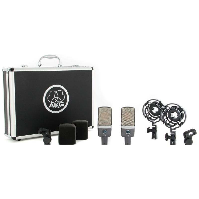 AKG C214 Matched Pair - набір, що містить два конденсаторні мікрофони C214, два еластичні підвіси типу "павук", два вітрозахисти, два поворотні холдери і транспортувальний кейс.
