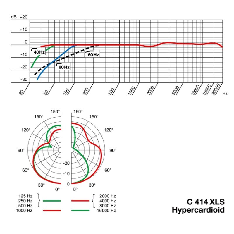 C414 XLS - універсальний конденсаторний мікрофон з подвійною однодюймовою діафрагмою, зі змінною діаграмою спрямованості (кардіоїда, гіперкардіоїда, кругова, 8-ка, широка кардіоїда) і приголомшливим динамічним діапазоном 134 дБ. Власний шум мікрофона не перевищує показника в 6 дБ-А, що відповідає рівню топових професійних студійних мікрофонів.