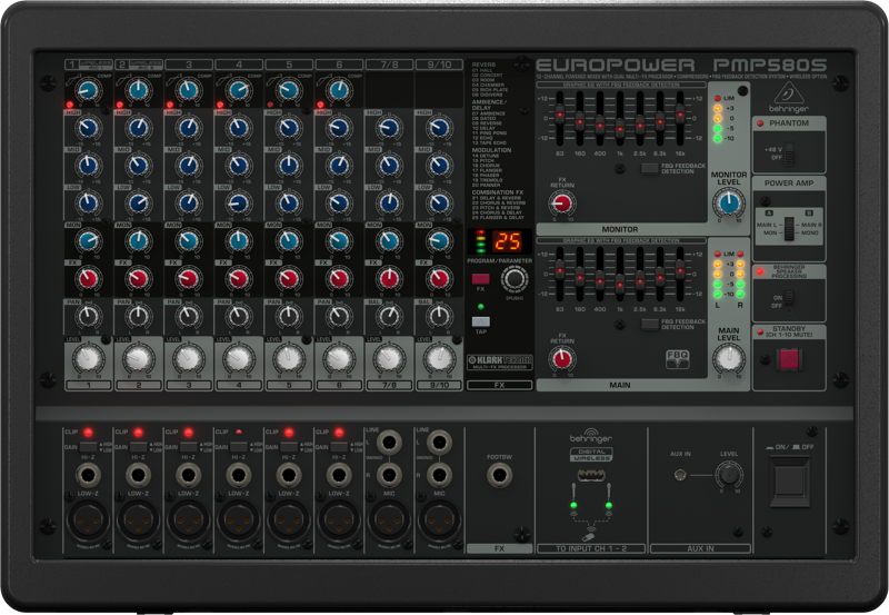EUROPOWER PMP580S забезпечує роботу з десятьма основними вхідними роз'ємами: двома монофонічними і двома парами стереофонічних. За необхідності моновходи перемикаються в режим сумісності з електрогітарами (Hi-Z). 8 мікрофонних входів, оснащених передпідсилювачами IMP, забезпечені джерелом фантомного живлення, і тому сумісні як з динамічними мікрофонами, так і з конденсаторними. Більше того: підключивши до спеціального роз'єму на консолі EUROPOWER PMP580S wireless-адаптер, звукооператор отримує можливість використовувати два бездротових мікрофони.