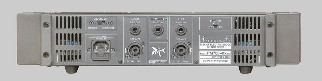 У даній моделі PM700-4fx MkII можна під'єднувати конденсаторні мікрофони, завдяки наявності фантомного живлення, тумблер якого розміщений на задній панелі. Крім усього іншого Park Audio PM700-4fx MkII має лінійні виходи, а також підсумований лінійний вихід на сабвуфер. Пристрій виконано в надійному корпусі типу 2U, який надійно захищає компоненти. Вага підсилювача мікшера становить 12 кг.