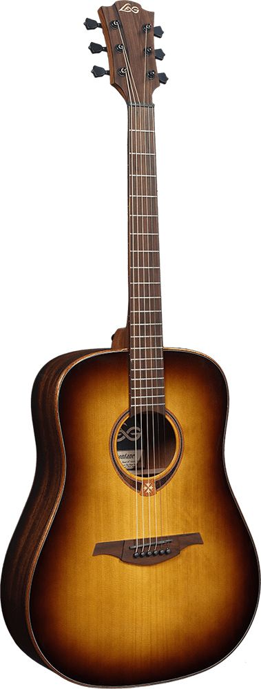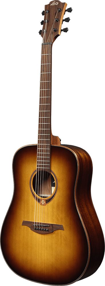 Lag Tramontane T118D-BRS - це шестиструнна акустична гітара в корпусі дредноут. Ця модель має багатий зовнішній вигляд, а найголовніше, відмінний звук, який досягається завдяки поєднанню цільної деревини червоного кедра (верхня дека) і африканського сапеле (обичайки і нижня дека). Гриф зроблений з дерева хайя і має накладку з коричневого дерева. Голова грифа і бридж також зроблені з коричневого дерева. Верхній і нижній поріжки виконані з чорного графіту. Мензура гітари становить 650 мм. Гриф має 20 ладів без інкрустації. Гітара може похвалитися двостороннім анкером, закритими кілками (Die Cast), вишуканою декоративною інкрустацією розетки з вплетеним логотипом оксітанського хреста, а також логотипом на голові грифа, що виготовлений з клена. Модель представлено в коричневому кольорі (Brown Shadow) із глянцевим покриттям.