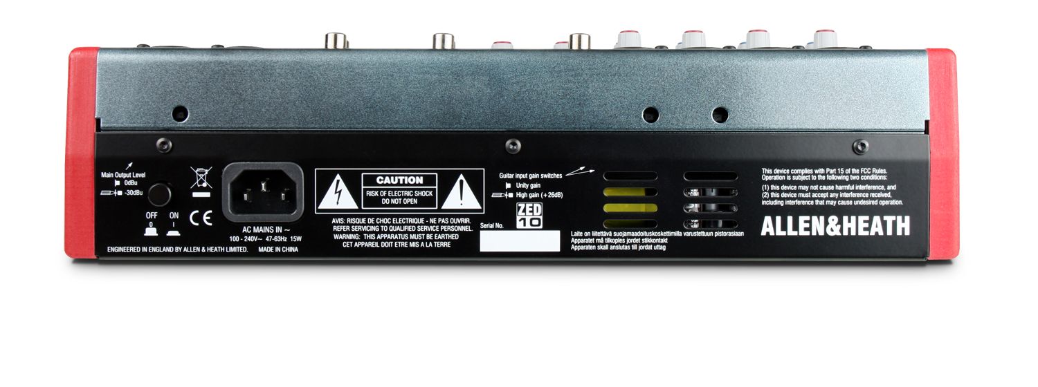 Allen Heath ZED10 - чудовий компактний мікшерний пульт для невеликих музичних колективів. Він має малі розміри і може бути використаний для "живої" роботи і запису під час виступів і в студії. Мікшер оснащений налаштованим вхідним\вихідним USB портом для високоякісного стерео запису. Гітари можна вмикати безпосередньо в мікшер, використовуючи для цього спеціально розроблені лінійки з великим вхідним опором, без використання DI боксів, дає змогу під'єднувати MP3/CD плеєри та клавішні інструменти. Модель оснащена високоякісними стерео XLR конекторами для гнучких можливостей моніторингу через навушники або студійні монітори.