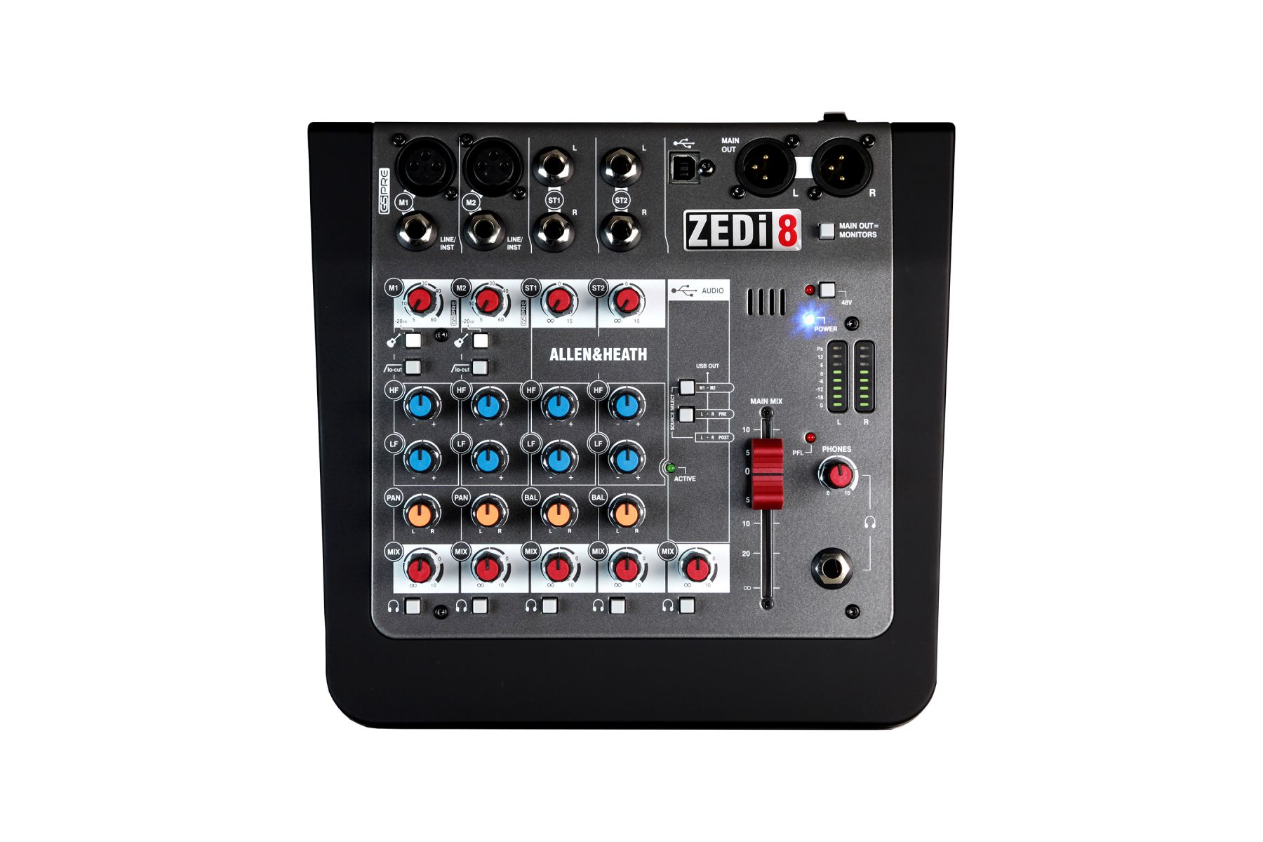 Allen & Heath ZEDi-8 - частина популярної серії мікшерних пультів Zed від A&H, модель призначена для звукозапису в домашніх умовах, виступів на невеликих заходах і т. д. Мікшер ZEDi-8 об'єднує в собі компактний пульт і 2 in/2 out USB аудіоінтерфейс (24 біта, 96 кГц). Він забезпечує запис і плейбек на Mac, PC і на девайси iOS iPhone/iPad (при цьому застосовується Camera Connection Kit) і має гнучкі можливості маршрутизації джерел. ZEDi-8 також "упакований" програмним забезпеченням Cubase LE і мобільним додатком Cubasis LE, які поставляються в комплекті з мікшером.