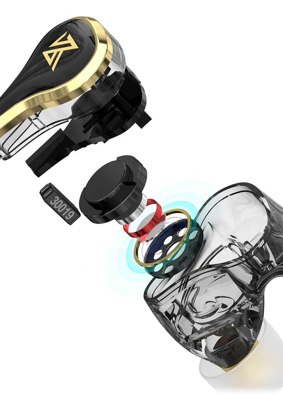 KZ SK10 Pro оснащені гібридною конструкцією драйверів, яка складається з двох балансних арматурних драйверів та одного динамічного драйвера на кожне вухо. Балансні арматурні драйвери відповідають за високі та середні частоти, забезпечуючи чистий та детальний звук. Динамічний драйвер відповідає за низькі частоти, додаючи глибину та потужність басів. Така комбінація дозволяє KZ SK10 Pro відтворювати широкий діапазон звуків із високою точністю та балансом.