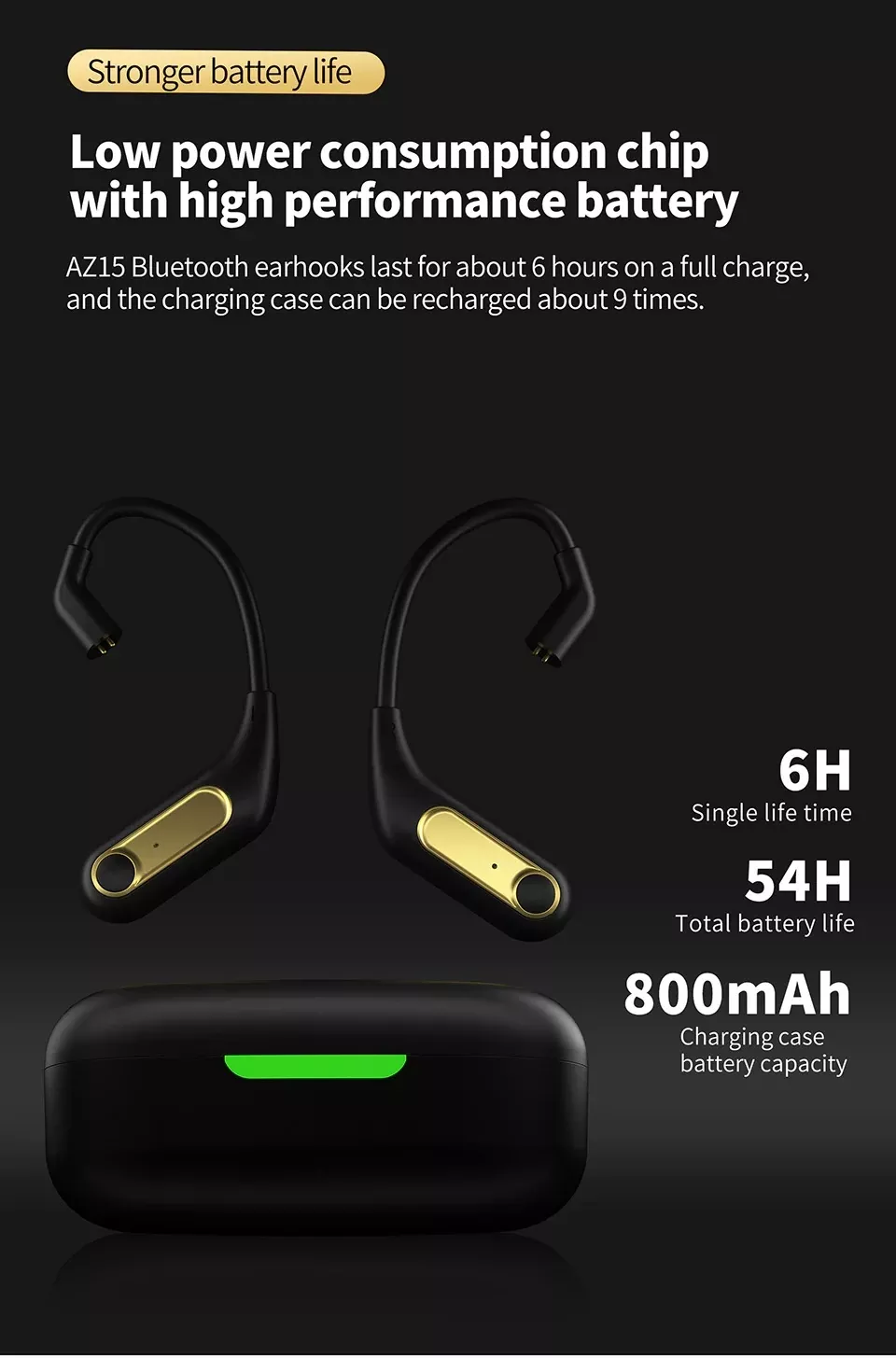 Qualcomm QCC3046 – це високопродуктивний Bluetooth-чіпсет з низьким енергоспоживанням. Завдяки вбудованій батареї, що перезаряджається, і цьому набору мікросхем з низьким енергоспоживанням користувачі отримають збільшений термін служби батареї з AZ15. Завушні гачки можуть працювати до 6 годин без заряджання, а чохол для зарядки забезпечує додаткові 48 годин відтворення. Це означає, що ви можете насолоджуватися бездротовим доступом до 54 годин.