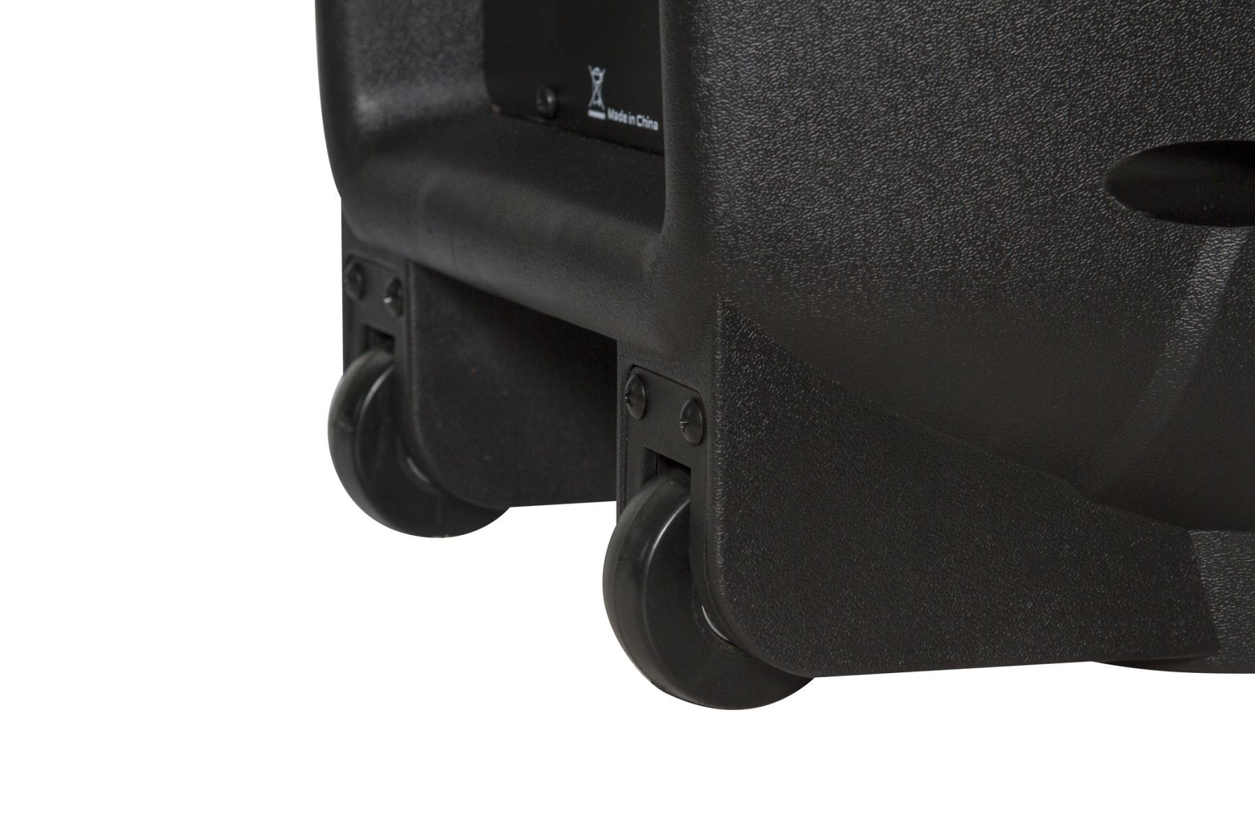 Акустична система виконана в міцному пластиковому корпусі і має зручну ручку і коліщатка для перевезення.