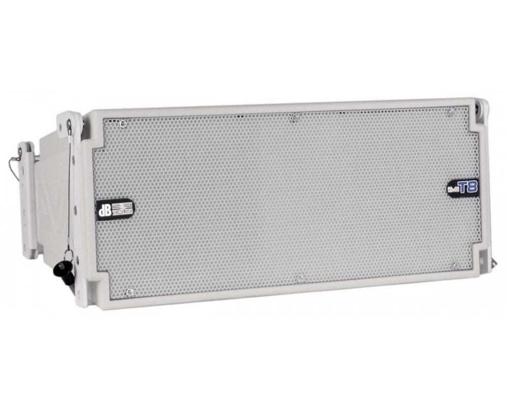 db Technologies DVA T8W - це активний 3-смуговий модуль лінійного масиву, оснащений 8" неодимовим низькочастотним динаміком, 1 рупором із 6,5" середньочастотним діапазоном із 2" звуковою котушкою і фазовим штекером, а також двома 1" драйверами з постійним обертальним сигналом. Ці компоненти були оптимально розташовані для отримання рівномірного покриття на 100° по 15° на модуль. DVA T8 оснащений цифровим підсилювачем класу D 700 Вт RMS Digipro G2 і здатний досягати до 132 дБ SPL.