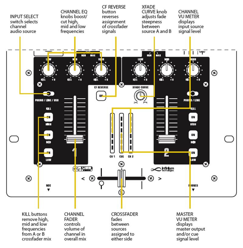- 2-канальний "бойовий" DJ-мікшер преміум-класу для найвимогливіших ді-джеїв, які працюють з вінілом, реміксерів і цифрових ді-джеїв.