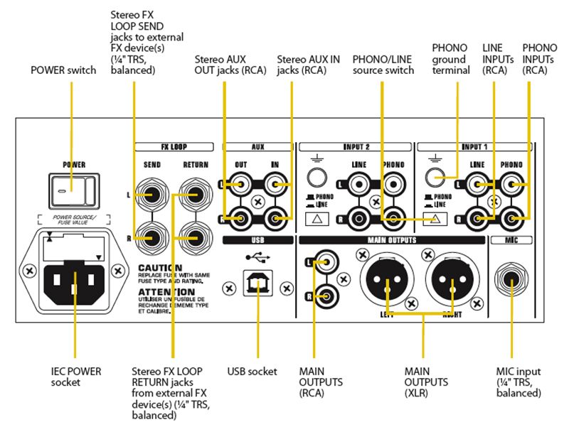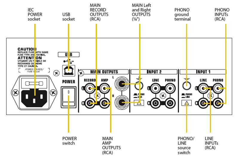 - 2 лінійні входи, порт USB, 2 входи Phono/Line і мікрофонний вхід.