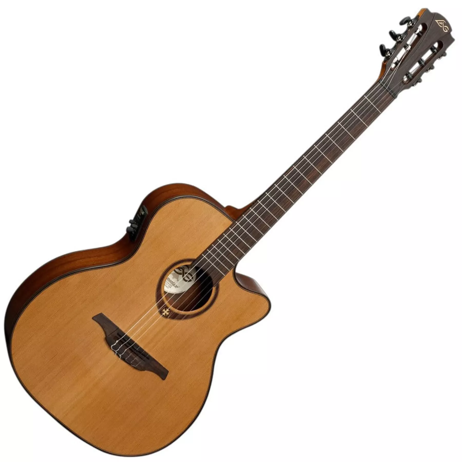 Lag Tramontane TN200A14CE – класична модель 6-струнної гітари з вбудованим звукознімачем. Верхня дека інструмента – масив червоного кедра, нижня дека та обичайки виготовлені з червоного дерева. Розетка інструмента традиційно декорована окситанським хрестом. Окантовка деки – індонезійський палісандр та клен. Матеріал грифа – червоне дерево з палісандровою накладкою, 2-бічний анкер. 20 ладів (срібно-нікелевих). Графітові верхній та нижній поріжок. Бридж з індонезійського палісандра. Механіка Die-cast, чорна, матова. Електроніка гітари – п’єзозвукознімач NanoFlex з преампом Studio Lag Plus. Колір інструмента – натуральний, покриття атласне.