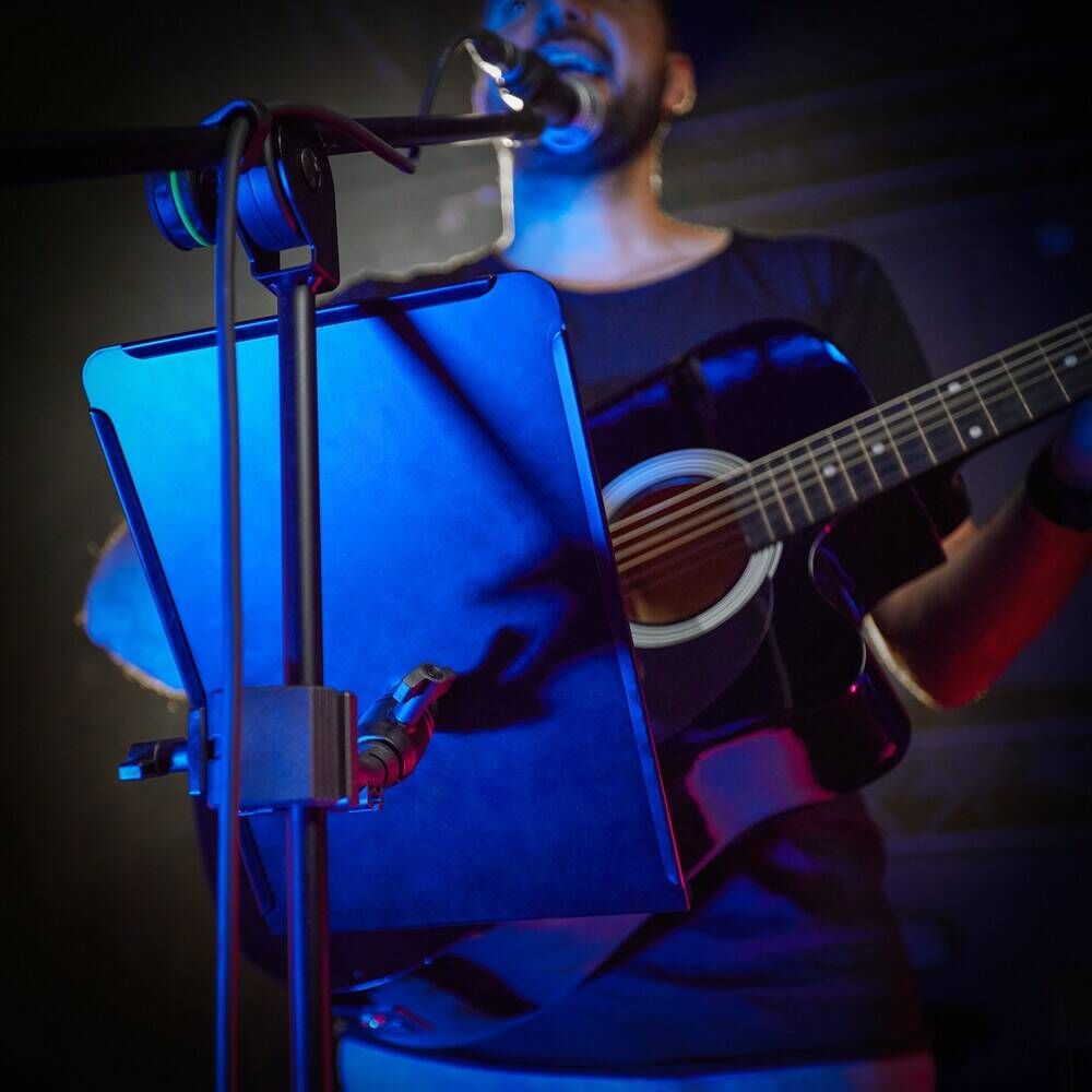 Gravity NS MS 02 - підставка для нот із серії Traveller Підставку для нот Gravity® NS MS 02 можна брати куди завгодно. Вона настільки легка, що вам зовсім не потрібно турбуватися про вагу або доступність. А суцільна поверхня столу та бортик дадуть вам змогу розмістити не лише ноти, а й смартфон чи планшет. Завдяки затискному важелю можлива швидка і проста установка. Великий діапазон затиску від 15 до 35 мм, можливість повороту на 360° і нахилу на 180° тримач для нот можна зручно розташувати. Це не тільки звільняє місце на сцені, а й гарантує, що у вас завжди буде чіткий огляд нот.