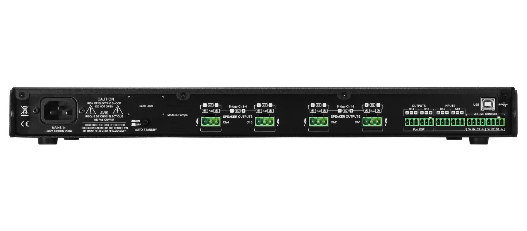 Підсилювач оснащений входами та виходами на роз'ємах Euroblock. Окрім основних входів та виходів для 4 каналів, наявні порт USB Type B для підключення до комп'ютера, та окремі роз'єми Euroblock для дистанційного регулювання гучності.