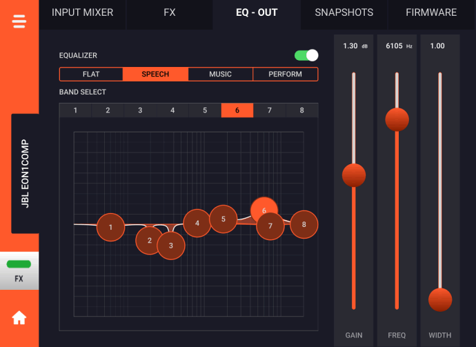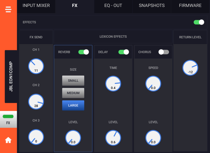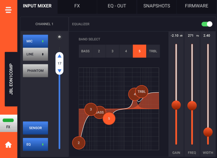 Кругова індикація дає змогу бачити поточне значення того чи іншого параметра і допомагає зорієнтуватися під час його регулювання. Більш детальні налаштування доступні з мобільного додатка JBL Compact Connect, що працює під управлінням iOS і Android пристроїв. Цей додаток дуже простий та інтуїтивно зрозумілий. Його інтерфейс дає змогу з легкістю керувати всіма наявними параметрами мікшера.