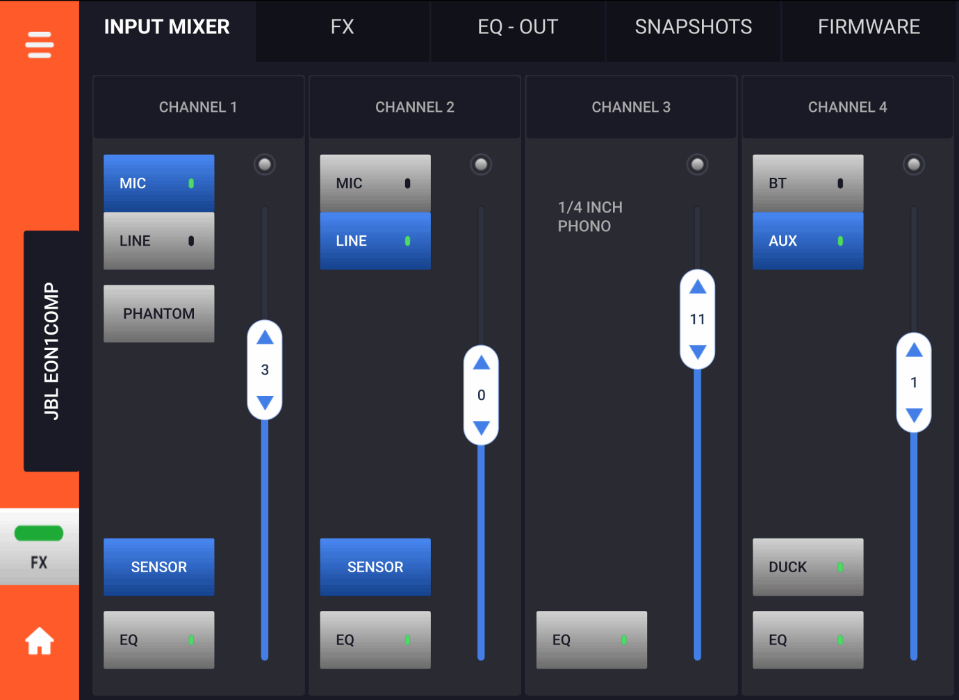 Управління в JBL EON ONE Compact виконано просто і досить цікаво. Кнопкою CH SELECT здійснюється перемикання між каналами, а поворотними регуляторами здійснюється регулювання рівня, еквалізація і посил сигналу на шину з ефектами. У режимі загальних налаштувань MIX Mode регуляторами здійснюється зміна рівня кожного з чотирьох каналів.