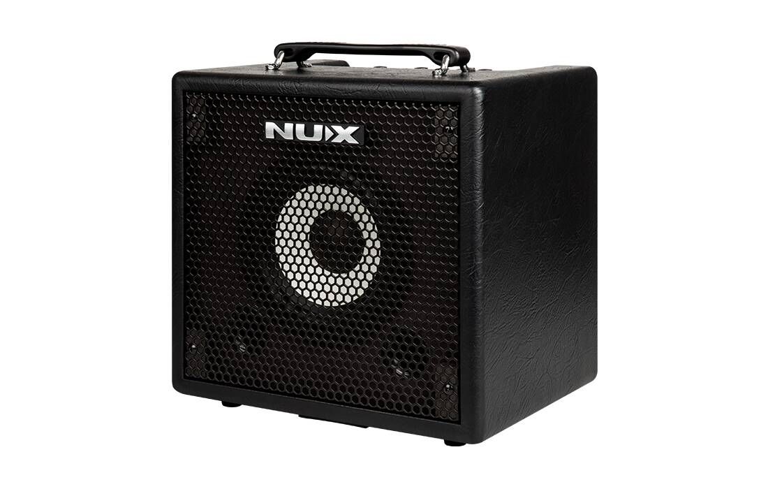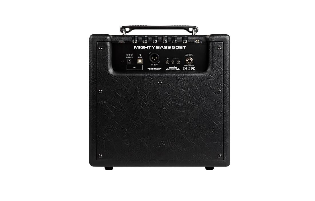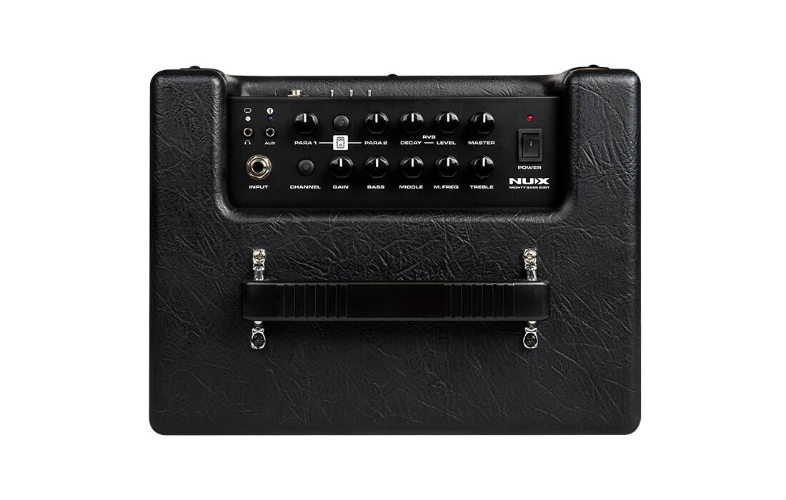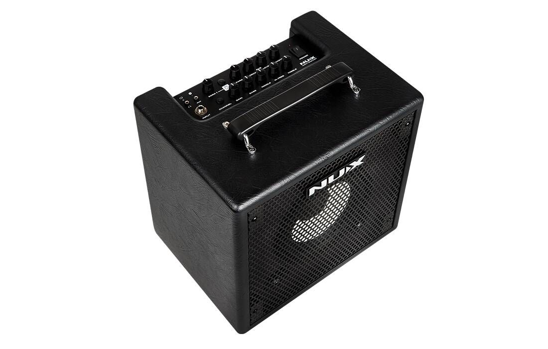 NUX Mighty Bass 50BT - портативний басовий комбопідсилювач. Mighty Bass 50BT має потужний і сучасний цифровий процесор, який забезпечує широкий функціонал, різноманітне звучання, зручність у роботі та можливість віддаленого налаштування всіх функцій. За відтворення аудіосигналу відповідає 6.5-дюймовий широкосмуговий динамік, що озвучує діапазон частот від 40 Гц до 16 кГц, що не тільки забезпечує повноцінне та насичене звучання бас-гітари, а й дає змогу відтворювати музику чи фонограми з достовірною АЧХ. Вбудований підсилювач має вихідну потужність 50 Вт. Пристрій підтримує налаштування через Bluetooth або за допомогою програми для комп'ютера, підключення до якого здійснюється через USB через порт USB-B. У програмному забезпеченні можна точно налаштувати всі параметри, завантажити імпульси кабінетів, а також обробити звучання різними ефектами, серед яких є компресор, фейзер, юнівайб, бустер, фуз та інші. Під час роботи з комплектним 2-кнопковим футвічем NMP-2 можна використовувати вбудований лупер з максимальною довжиною запису 60 сек. Також тут є USB-аудіоінтерфейс, що дає змогу здійснювати запис безпосередньо на комп'ютер. На верхній частині корпусу розташовані фізичні органи управління. Для корекції тембру є 3-смуговий еквалайзер з окремою ручкою, що відповідають за вибір частоти для регулятора Middle.
