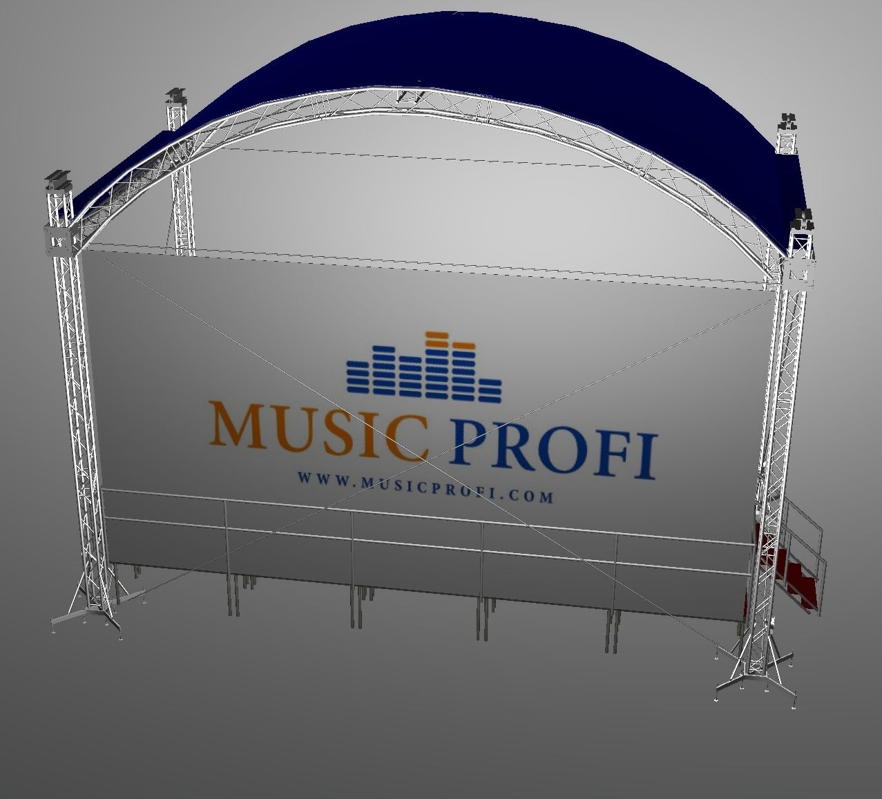 Подіум сцени складається з двадцяти чотирьох однакових модулів, які виготовлені з міцного алюмінієвого сплаву і мають знімні ноги. У нижню частину кожної ноги вбудований домкрат, що дає змогу регулювати їхню висоту. Модулі подіуму скріплюються один з одним спеціальними затискачами. Зібрана сцена має перила з трьох сторін по периметру. Покриття підлоги виготовлено з ударостійкої і захищеної від вологи фанери. Вона так само має спеціальне покриття проти ковзання. Сцена оснащена двома сходами з лівого і з правого боку, які так само мають перила.