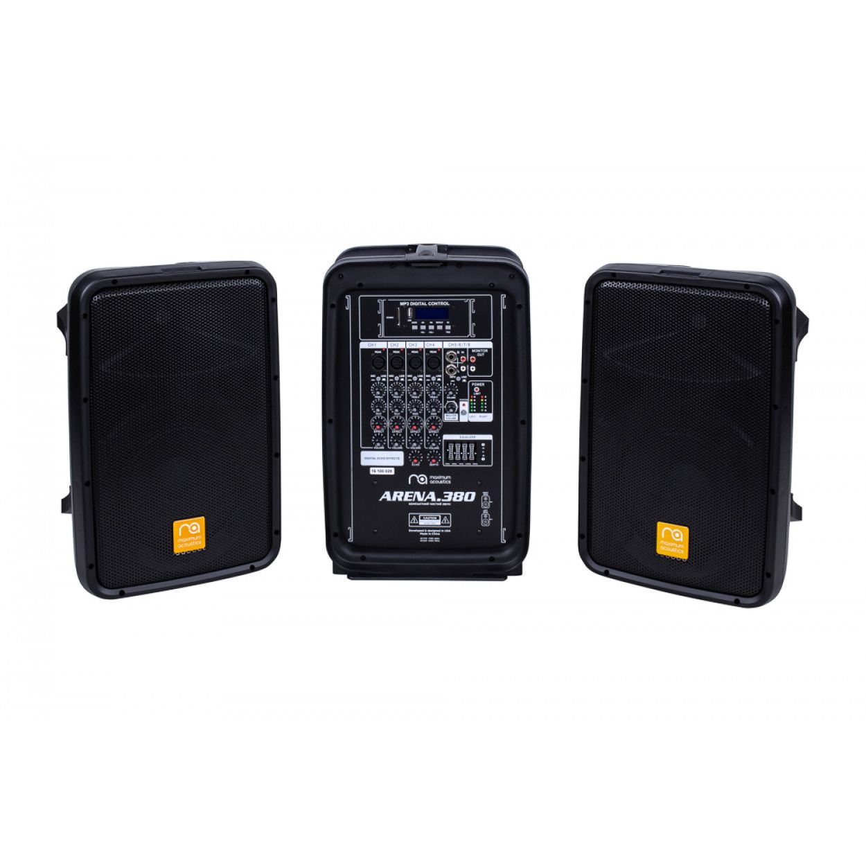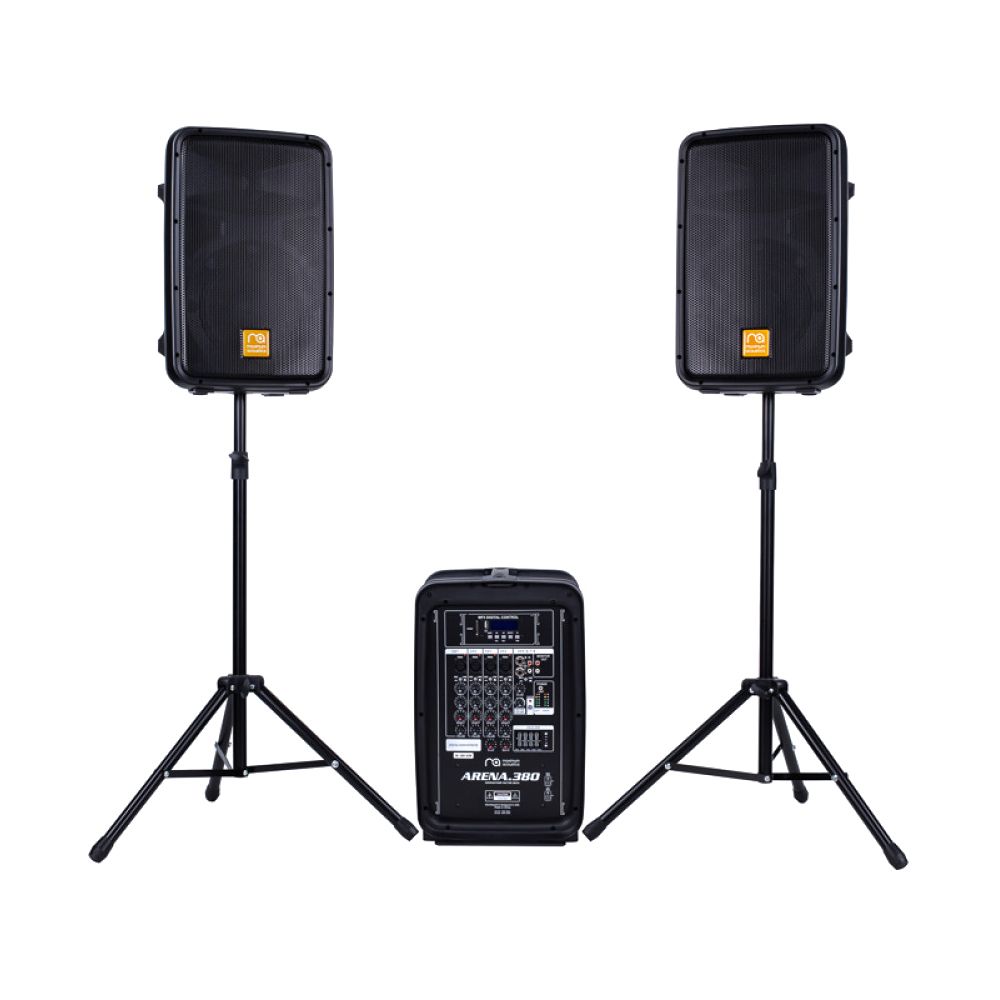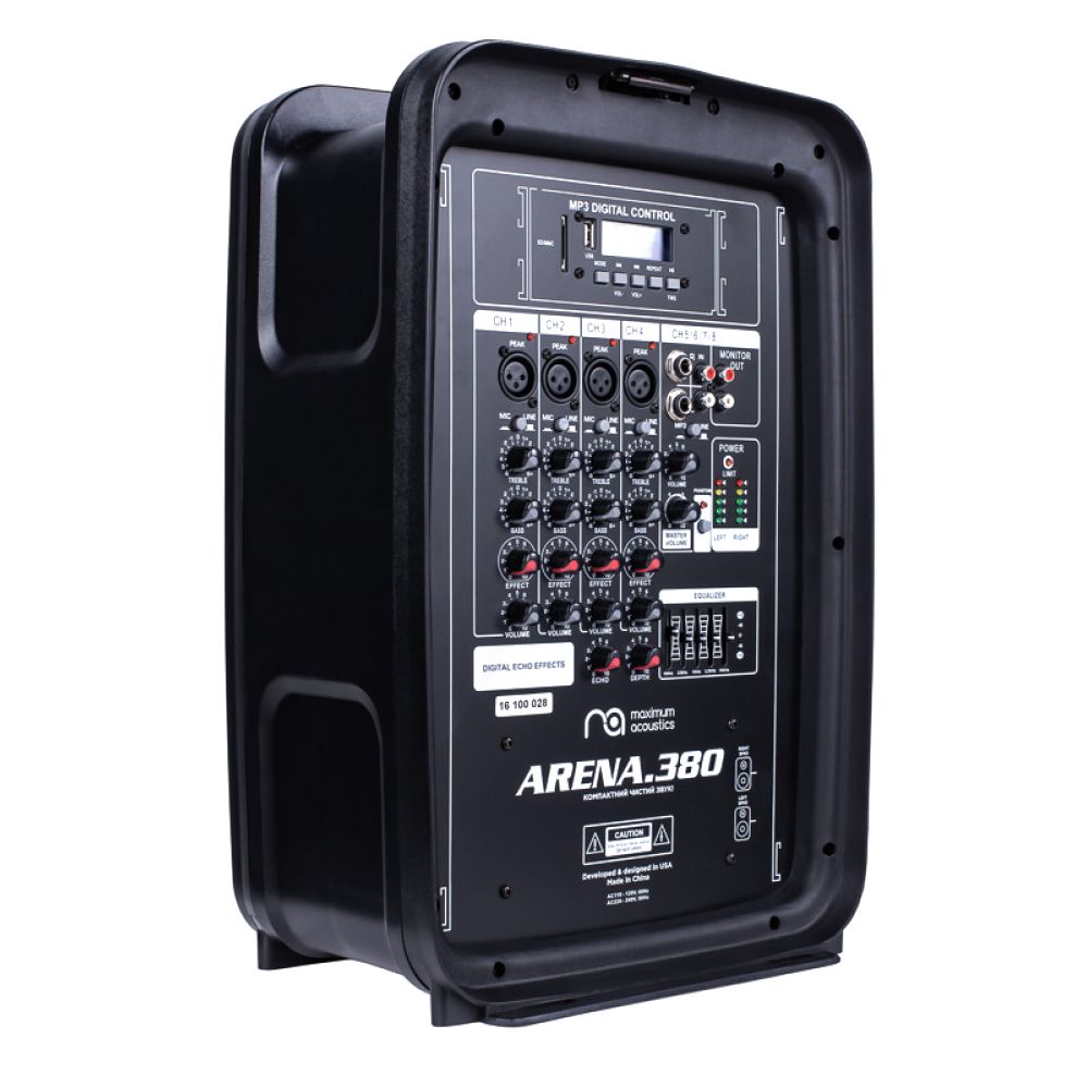 Maximum Acoustics Аrena.380 - це універсальний активний комплект гучномовців "Все-в-одному", що складається з двох акустичних систем, 8-канального мікшера з вмонтованим підсилювачем, двох стійок і двох дротових мікрофонів. Завдяки багатому функціоналу та широким можливостям під'єднання Аrena.380 ідеально підходить для виступів на сцені, виїзних подій, публічних заходів, ВТL-акцій, а також стаціонарної роботи в клубах, ресторанах, кафе тощо.