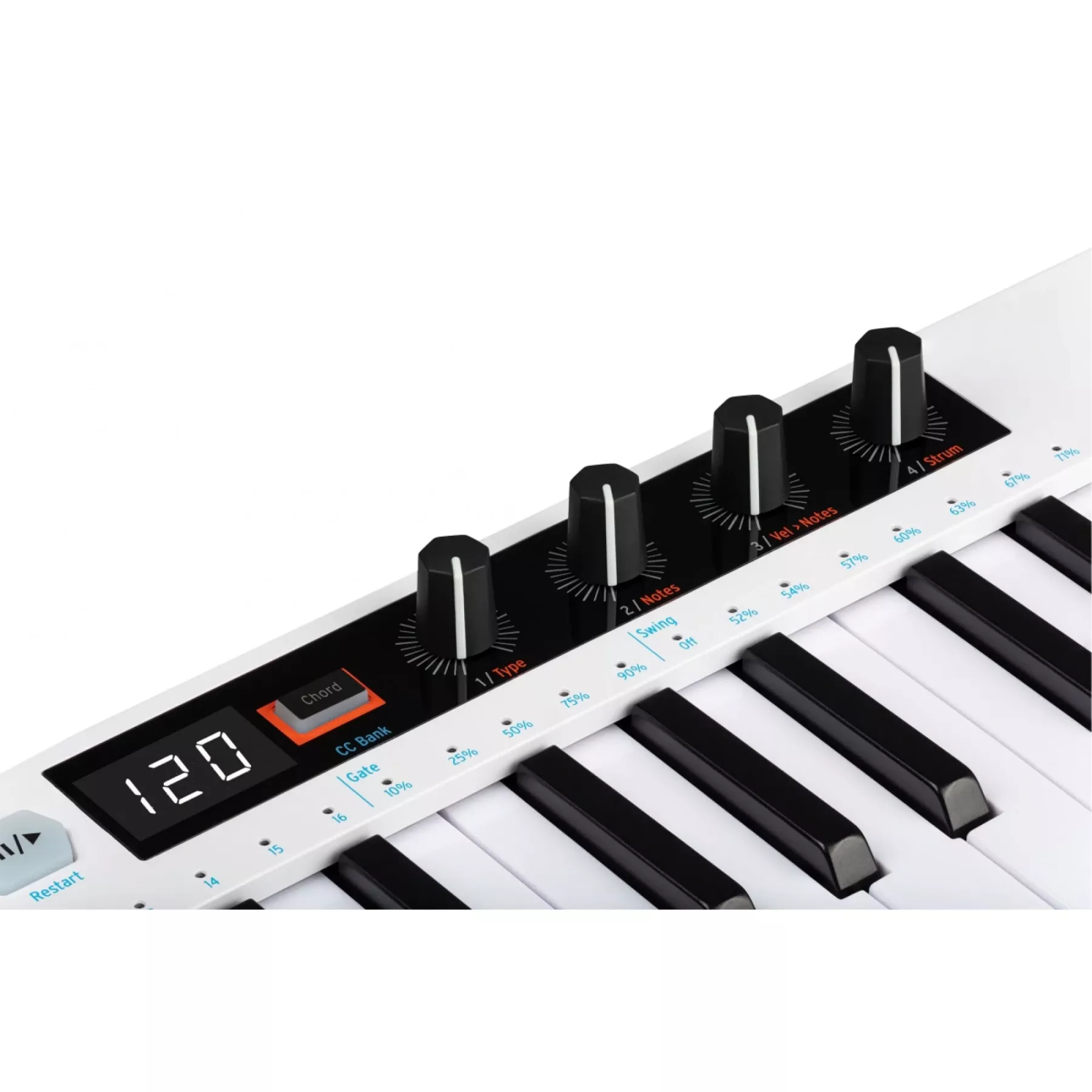 Завдяки унікальному і вдосконаленому режиму Chord, KeyStep 37 бере кожну ноту Вашої мелодії змішуючи з нереалізованими ідеями і перетворює їх в музичні сходинки. Вибирайте з декількох озвучок, інструментальних ефектів удару по струнах і налаштувань рівня velosity - все для того щоб Ваша музика співала по-справжньому.