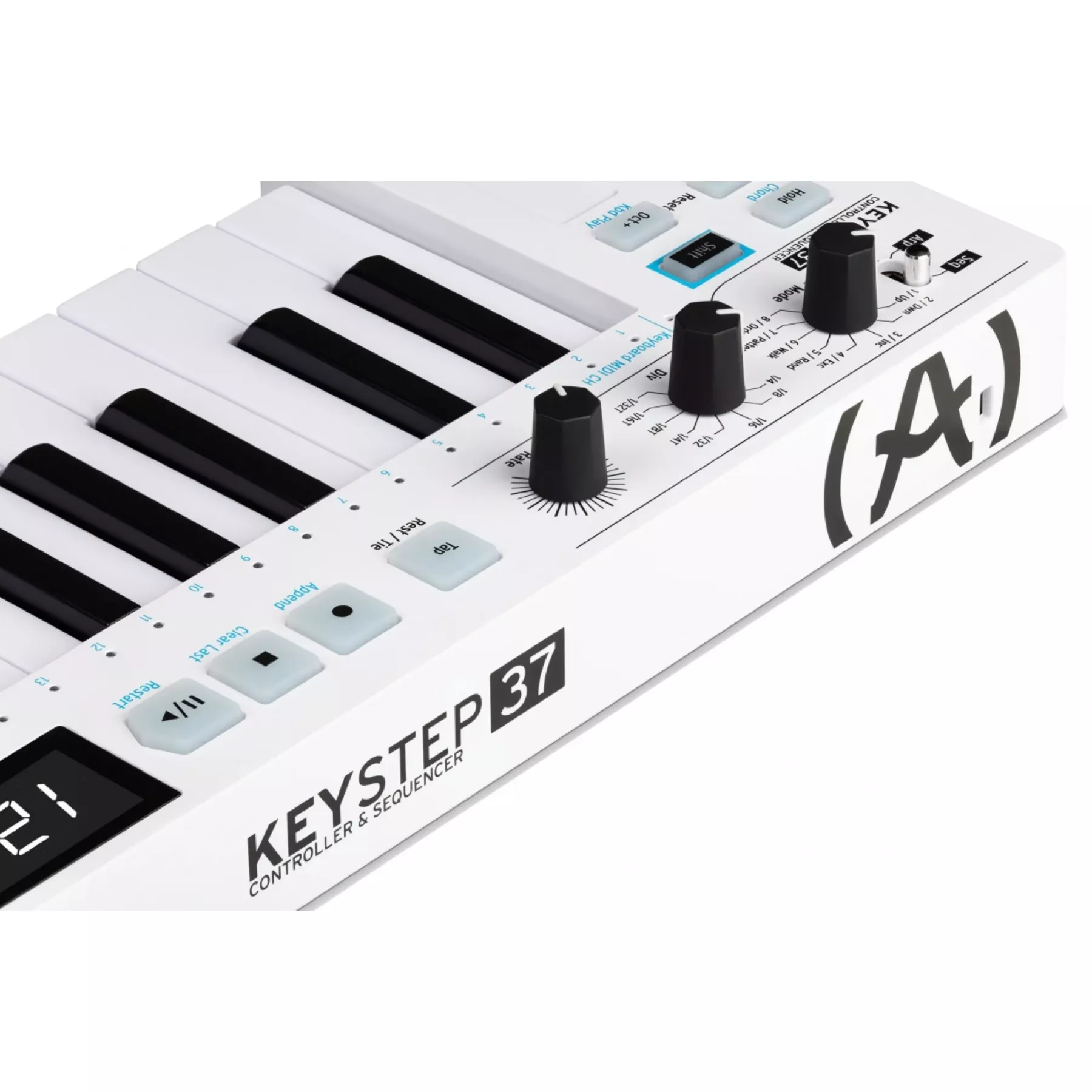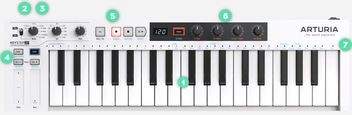 KeyStep має секвенсор і арпеджіатор. Ви можете записати вісім різних секвенцій, кожна з яких може містити до 64 кроків. Арпеджіатор генерує ноти на основі натиснутих Вами клавіш і відтворює їх у відповідності з налаштуванням режиму Arp.