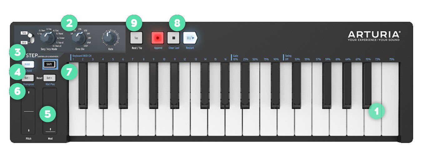 KeyStep має секвенсор і арпеджіатор. Ви можете записати вісім різних секвенцій, кожна з яких може містити до 64 кроків. Арпеджіатор генерує ноти на основі натиснутих Вами клавіш і відтворює їх у відповідності з налаштуванням режиму Arp.